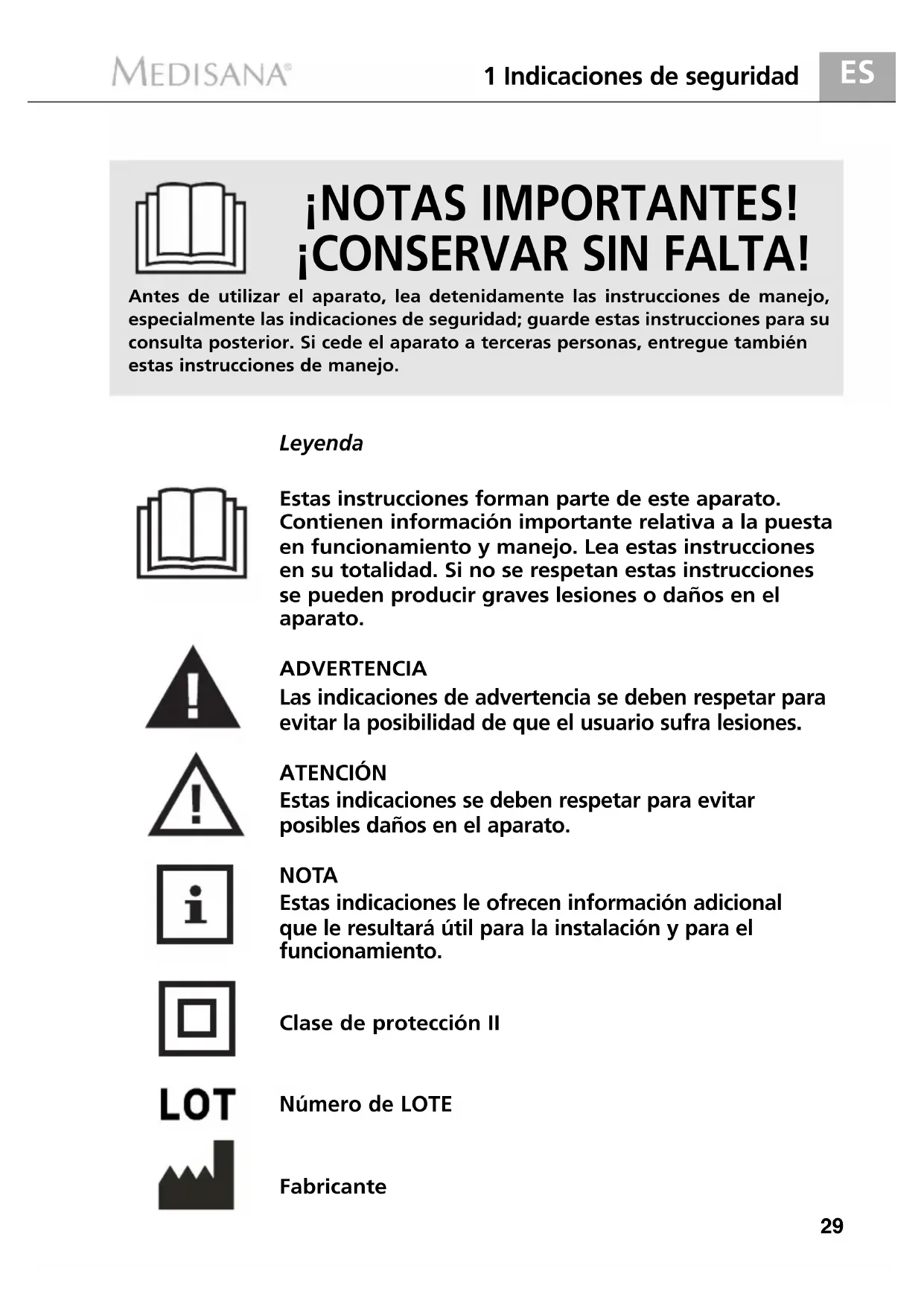 ¡NOTAS IMPORTANTES! ¡CONSERVAR SIN FALTA! Estas instrucciones forman parte de este aparato.Contienen información importante relativa a la puestaen funcionamiento y manejo. Lea estas instruccionesen su totalidad. Si no se respetan estas instruccionesse pueden producir graves lesiones o daños en elaparato.ADVERTENCIA Las indicaciones de advertencia se deben respetar para evitar la posibilidad de que el usuario sufra lesiones. ATENCIÓN Estas indicaciones se deben respetar para evitar posibles daños en el aparato. NOTA Estas indicaciones le ofrecen información adicional que le resultará útil para la instalación y para el funcionamiento. Clase de protección II Número de LOTE FabricanteAntes de utilizar el aparato, lea detenidamente las instrucciones de manejo,especialmente las indicaciones de seguridad; guarde estas instrucciones para suconsulta posterior. Si cede el aparato a terceras personas, entregue tambiénestas instrucciones de manejo. Leyenda 61200_GA_HU_660_West_03.08.qxd:Wärmeunterbett 03.08.2012 11:50 Uhr Seite 2930 1 Indicaciones de seguridad