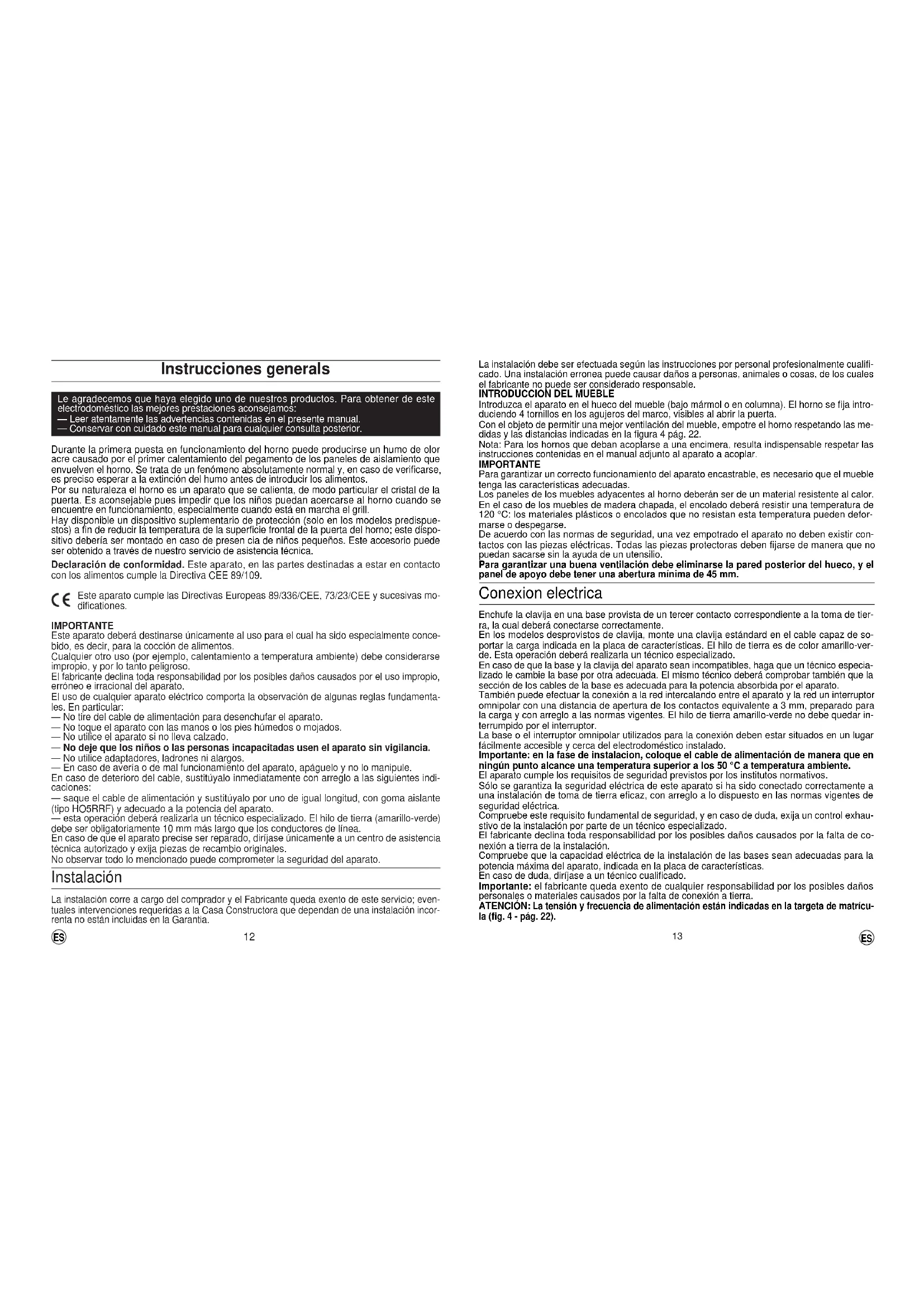 The manufacturer will not be responsible for any inaccuracy resulting from printing or transcript errors contained in this brochure. We reserve the right to carry out modifications to products as required, including the interests of consumption, without prejudice to the characteristics relating to safety or function. INSTALLATION Rating plate EN13 Instrucciones generals Le agradecemos que haya elegido uno de nuestros productos. Para obtener de este electrodoméstico las mejores prestaciones aconsejamos: — Leer atentamente las advertencias contenidas en el presente manual. — Conservar con cuidado este manual para cualquier consulta posterior. Durante la primera puesta en funcionamiento del horno puede producirse un humo de olor acre causado por el primer calentamiento del pegamento de los paneles de aislamiento que envuelven el horno. Se trata de un fenómeno absolutamente normal y, en caso de verificarse, es preciso esperar a la extinción del humo antes de introducir los alimentos. Por su naturaleza el horno es un aparato que se calienta, de modo particular el cristal de la puerta. Es aconsejable pues impedir que los niños puedan acercarse al horno cuando se encuentre en funcionamiento, especialmente cuando está en marcha el grill. Hay disponible un dispositivo suplementario de protección (solo en los modelos predispue- stos) a fin de reducir la temperatura de la superficie frontal de la puerta del horno; este dispo- sitivo debería ser montado en caso de presen cia de niños pequeños. Este accesorio puede ser obtenido a través de nuestro servicio de asistencia técnica. Declaración de conformidad. Este aparato, en las partes destinadas a estar en contacto con los alimentos cumple la Directiva CEE 89/109. Este aparato cumple las Directivas Europeas 89/336/CEE, 73/23/CEE y sucesivas mo- dificationes. IMPORTANTE Este aparato deberá destinarse únicamente al uso para el cual ha sido especialmente conce- bido, es decir, para la cocción de alimentos. Cualquier otro uso (por ejemplo, calentamiento a temperatura ambiente) debe considerarse impropio, y por lo tanto peligroso. El fabricante declina toda responsabilidad por los posibles daños causados por el uso impropio, erróneo e irracional del aparato. El uso de cualquier aparato eléctrico comporta la observación de algunas reglas fundamenta- les. En particular: — No tire del cable de alimentación para desenchufar el aparato. — No toque el aparato con las manos o los pies húmedos o mojados. — No utilice el aparato si no lleva calzado. — No deje que los niños o las personas incapacitadas usen el aparato sin vigilancia. — No utilice adaptadores, ladrones ni alargos. — En caso de avería o de mal funcionamiento del aparato, apáguelo y no lo manipule. En caso de deterioro del cable, sustitúyalo inmediatamente con arreglo a las siguientes indi- caciones: — saque el cable de alimentación y sustitúyalo por uno de igual longitud, con goma aislante (tipo HO5RRF) y adecuado a la potencia del aparato. — esta operación deberá realizarla un técnico especializado. El hilo de tierra (amarillo-verde) debe ser obligatoriamente 10 mm más largo que los conductores de línea. En caso de que el aparato precise ser reparado, diríjase únicamente a un centro de asistencia técnica autorizado y exija piezas de recambio originales. No observar todo lo mencionado puede comprometer la seguridad del aparato. Instalación La instalación corre a cargo del comprador y el Fabricante queda exento de este servicio; even- tuales intervenciones requeridas a la Casa Constructora que dependan de una instalación incor- renta no están incluidas en la Garantia.