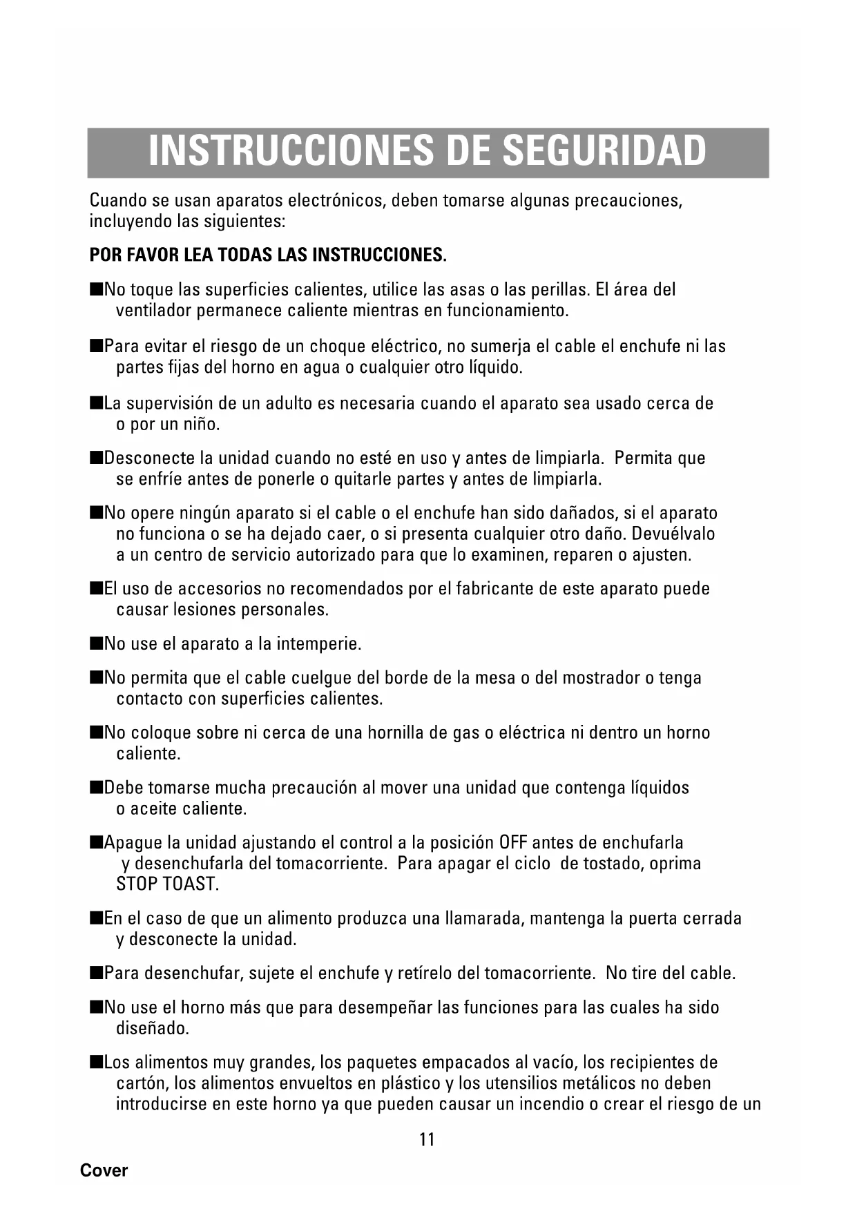Cuando se usan aparatos electrónicos, deben tomarse algunas precauciones, incluyendo las siguientes: POR FAVOR LEA TODAS LAS INSTRUCCIONES. ■ No toque las superficies calientes, utilice las asas o las perillas. El área del ventilador permanece caliente mientras en funcionamiento. ■ Para evitar el riesgo de un choque eléctrico, no sumerja el cable el enchufe ni las partes fijas del horno en agua o cualquier otro líquido. ■ La supervisión de un adulto es necesaria cuando el aparato sea usado cerca de o por un niño. ■ Desconecte la unidad cuando no esté en uso y antes de limpiarla. Permita que se enfríe antes de ponerle o quitarle partes y antes de limpiarla. ■ No opere ningún aparato si el cable o el enchufe han sido dañados, si el aparato no funciona o se ha dejado caer, o si presenta cualquier otro daño. Devuélvalo a un centro de servicio autorizado para que lo examinen, reparen o ajusten. ■ El uso de accesorios no recomendados por el fabricante de este aparato puede causar lesiones personales. ■ No use el aparato a la intemperie. ■ No permita que el cable cuelgue del borde de la mesa o del mostrador o tenga contacto con superficies calientes. ■ No coloque sobre ni cerca de una hornilla de gas o eléctrica ni dentro un horno caliente. ■ Debe tomarse mucha precaución al mover una unidad que contenga líquidos o aceite caliente. ■ Apague la unidad ajustando el control a la posición OFF antes de enchufarla y desenchufarla del tomacorriente. Para apagar el ciclo de tostado, oprima STOP TOAST. ■ En el caso de que un alimento produzca una llamarada, mantenga la puerta cerrada y desconecte la unidad. ■ Para desenchufar, sujete el enchufe y retírelo del tomacorriente. No tire del cable. ■ No use el horno más que para desempeñar las funciones para las cuales ha sido diseñado. ■ Los alimentos muy grandes, los paquetes empacados al vacío, los recipientes de cartón, los alimentos envueltos en plástico y los utensilios metálicos no deben introducirse en este horno ya que pueden causar un incendio o crear el riesgo de un Cover12 ENCHUFE POLARIZADO Se emplean enchufes polarizados con un contacto más ancho que el otro para reducir los riesgos de choque eléctrico. Cuando el cable tiene este tipo de enchufe, se ajusta únicamente a un contacto polarizado. Si el enchufe no se ajusta en su contacto, inviértalo. Si aún así no se ajusta, busque la ayuda de un electricista calificado para que instale un contacto polarizado apropiado. Por ningún punto trate de modificar o hacerle cambios al enchufe.