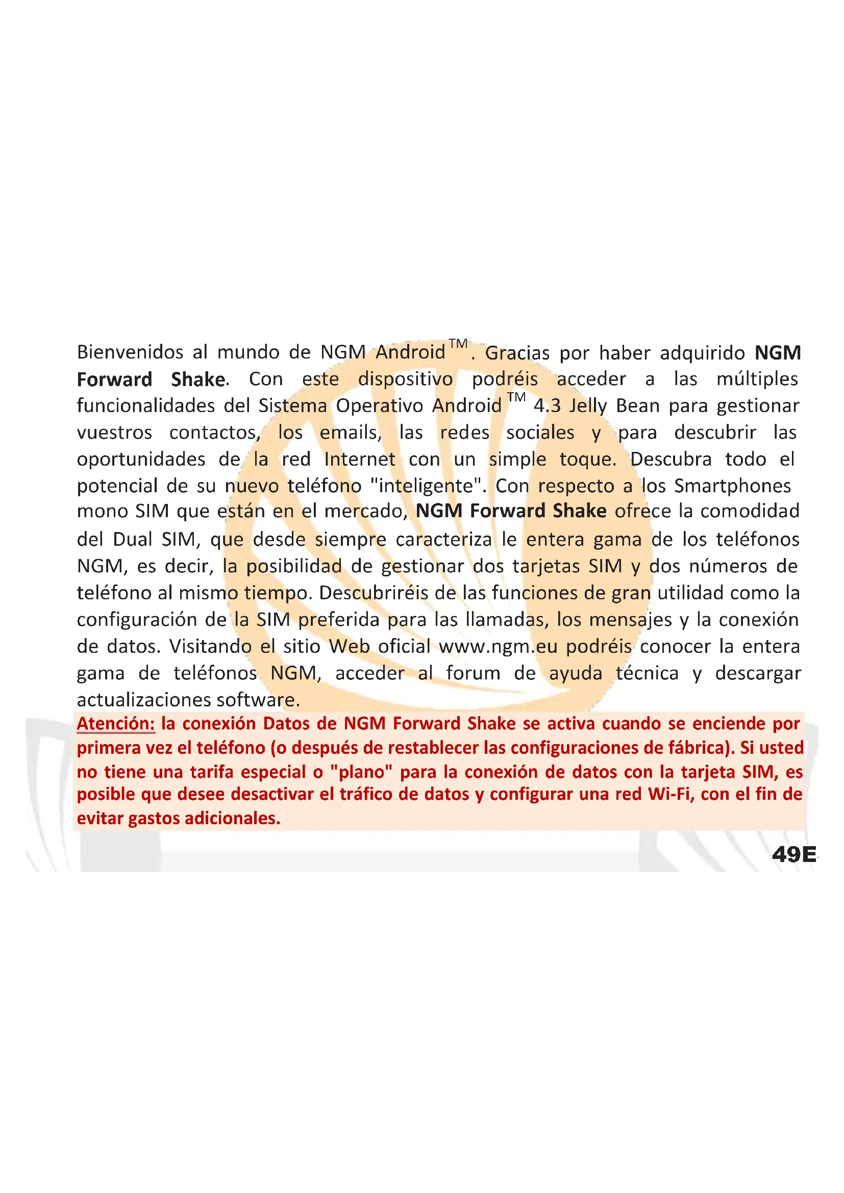 vuestros contactos, los emails, las red es sociales y para descubrir las oportunidades de la red Internet con un simple toque. Descubra todo el potencial de su nuevo teléfono "inteligente". Con respecto a los Smartphones mono SIM que están en el mercado, NGM Forward Shake ofrece la comodidad del Dual SIM, que desde siempre caracteriza le entera gama de los teléfonos NGM, es decir, la posibilidad de gestionar dos tarjetas SIM y dos números de teléfono al mismo tiempo. Descubriréis de las funciones de gran utilidad como la configuración de la SIM preferida para las llamadas, los mensajes y la conexión de datos. Visitando el sitio Web oficial www.ngm.eu podréis conocer la entera gama de teléfonos NGM, acceder al forum de ayuda técnica y descargar actualizaciones software. Atención: la conexión Datos de NGM Forward Shake se activa cuando se enciende por primera vez el teléfono (o después de restablecer las configuraciones de fábrica). Si usted no tiene una tarifa especial o "plano" para la conexión de datos con la tarjeta SIM, es posible que desee desactivar el tráfico de datos y configurar una red Wi-Fi, con el fin de evitar gastos adicionales.50 ESPAÑOL Montaje