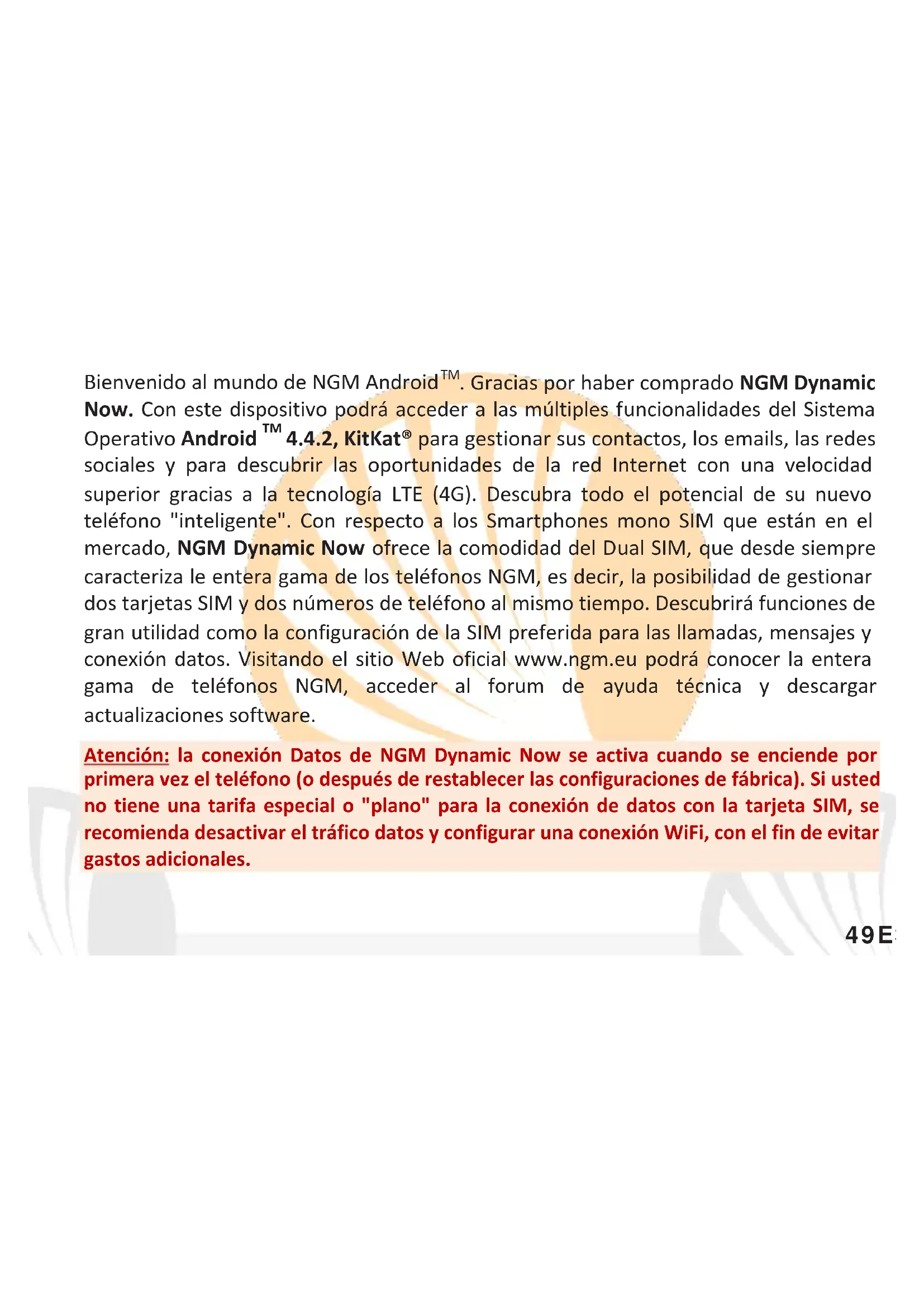 sociales y para descubrir las oportunidades de la red Internet con una velocidad superior gracias a la tecnología LTE (4G). Descubra todo el potencial de su nuevo teléfono "inteligente". Con respecto a los Smartphones mono SIM que están en el mercado, NGM Dynamic Now ofrece la comodidad del Dual SIM, que desde siempre caracteriza le entera gama de los teléfonos NGM, es decir, la posibilidad de gestionar dos tarjetas SIM y dos números de teléfono al mismo tiempo. Descubrirá funciones de gran utilidad como la configuración de la SIM preferida para las llamadas, mensajes y conexión datos. Visitando el sitio Web oficial www.ngm.eu podrá conocer la entera gama de teléfonos NGM, acceder al forum de ayuda técnica y descargar actualizaciones software. Atención: la conexión Datos de NGM Dynamic Now se activa cuando se enciende por primera vez el teléfono (o después de restablecer las configuraciones de fábrica). Si usted no tiene una tarifa especial o "plano" para la conexión de datos con la tarjeta SIM, se recomienda desactivar el tráfico datos y configurar una conexión WiFi, con el fin de evitar gastos adicionales.50 ESPAÑOL Montaje