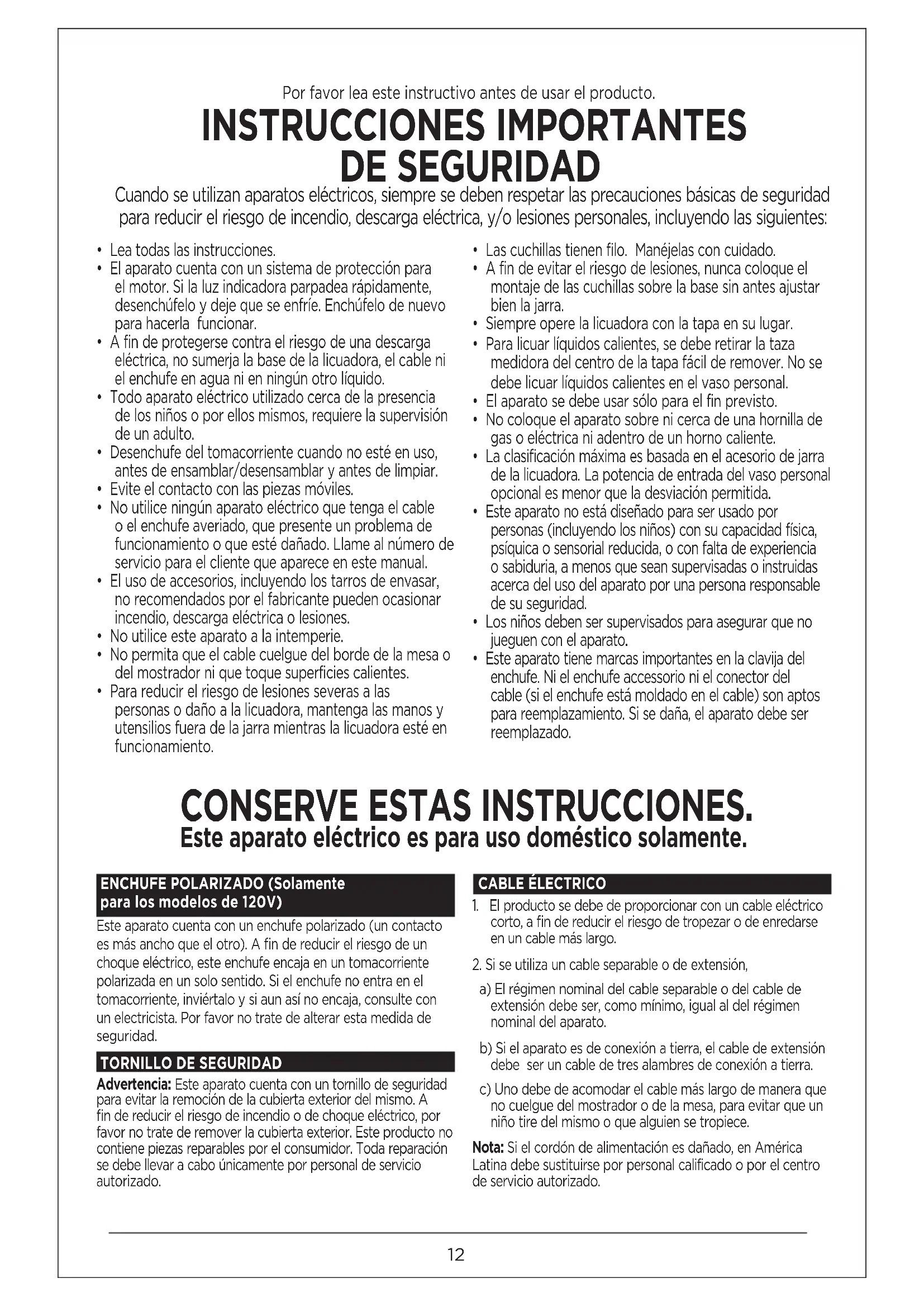 - Este aparato tiene marcas importantes en la clavija del enchufe. Ni el enchufe accessorio ni el conector del cable (si el enchufe está moldado en el cable) son aptos para reemplazamiento. Si se daña, el aparato debe ser reemplazado. ENCHUFE POLARIZADO (Solamente para los modelos de 120V)Este aparato cuenta con un enchufe polarizado (un contacto es más ancho que el otro). A fin de reducir el riesgo de un choque eléctrico, este enchufe encaja en un tomacorriente polarizada en un solo sentido. Si el enchufe no entra en el tomacorriente, inviértalo y si aun así no encaja, consulte con un electricista. Por favor no trate de alterar esta medida de seguridad.TORNILLO DE SEGURIDADAdvertencia: Este aparato cuenta con un tornillo de seguridad para evitar la remoción de la cubierta exterior del mismo. A fin de reducir el riesgo de incendio o de choque eléctrico, por favor no trate de remover la cubierta exterior. Este producto no contiene piezas reparables por el consumidor. Toda reparación se debe llevar a cabo únicamente por personal de servicio autorizado.CABLE ÉLECTRICO1. El producto se debe de proporcionar con un cable eléctrico corto, a fin de reducir el riesgo de tropezar o de enredarse en un cable más largo.2. Si se utiliza un cable separable o de extensión, a) El régimen nominal del cable separable o del cable de extensión debe ser, como mínimo, igual al del régimen nominal del aparato. b) Si el aparato es de conexión a tierra, el cable de extensión debe ser un cable de tres alambres de conexión a tierra. c) Uno debe de acomodar el cable más largo de manera que no cuelgue del mostrador o de la mesa, para evitar que un niño tire del mismo o que alguien se tropiece.Nota: Si el cordón de alimentación es dañado, en América Latina debe sustituirse por personal calificado o por el centro de servicio autorizado. CONSERVE ESTAS INSTRUCCIONES. Este aparato eléctrico es para uso doméstico solamente. Por favor lea este instructivo antes de usar el producto. INSTRUCCIONES IMPORTANTES DE SEGURIDAD Cuando se utilizan aparatos eléctricos, siempre se deben respetar las precauciones básicas de seguridad para reducir el riesgo de incendio, descarga eléctrica, y/o lesiones personales, incluyendo las siguientes:13