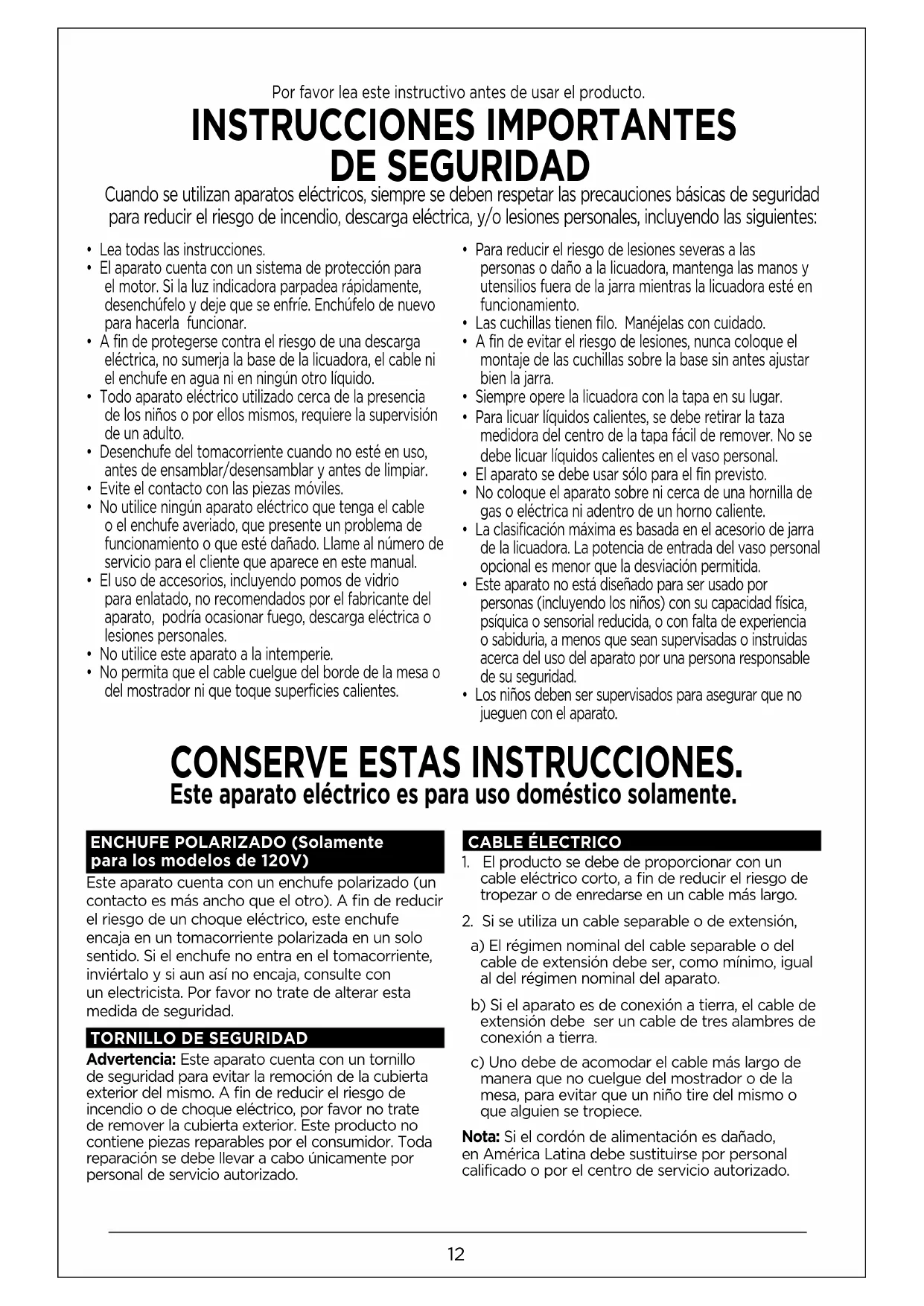 - Los niños deben ser supervisados para asegurar que no jueguen con el aparato. ENCHUFE POLARIZADO (Solamente para los modelos de 120V)Este aparato cuenta con un enchufe polarizado (un contacto es más ancho que el otro). A fin de reducir el riesgo de un choque eléctrico, este enchufe encaja en un tomacorriente polarizada en un solo sentido. Si el enchufe no entra en el tomacorriente, inviértalo y si aun así no encaja, consulte con un electricista. Por favor no trate de alterar esta medida de seguridad.TORNILLO DE SEGURIDADAdvertencia: Este aparato cuenta con un tornillo de seguridad para evitar la remoción de la cubierta exterior del mismo. A fin de reducir el riesgo de incendio o de choque eléctrico, por favor no trate de remover la cubierta exterior. Este producto no contiene piezas reparables por el consumidor. Toda reparación se debe llevar a cabo únicamente por personal de servicio autorizado.CABLE ÉLECTRICO1. El producto se debe de proporcionar con un cable eléctrico corto, a fin de reducir el riesgo de tropezar o de enredarse en un cable más largo.2. Si se utiliza un cable separable o de extensión, a) El régimen nominal del cable separable o del cable de extensión debe ser, como mínimo, igual al del régimen nominal del aparato. b) Si el aparato es de conexión a tierra, el cable de extensión debe ser un cable de tres alambres de conexión a tierra. c) Uno debe de acomodar el cable más largo de manera que no cuelgue del mostrador o de la mesa, para evitar que un niño tire del mismo o que alguien se tropiece.Nota: Si el cordón de alimentación es dañado, en América Latina debe sustituirse por personal calificado o por el centro de servicio autorizado. CONSERVE ESTAS INSTRUCCIONES. Este aparato eléctrico es para uso doméstico solamente. Por favor lea este instructivo antes de usar el producto. INSTRUCCIONES IMPORTANTES DE SEGURIDAD Cuando se utilizan aparatos eléctricos, siempre se deben respetar las precauciones básicas de seguridad para reducir el riesgo de incendio, descarga eléctrica, y/o lesiones personales, incluyendo las siguientes:13