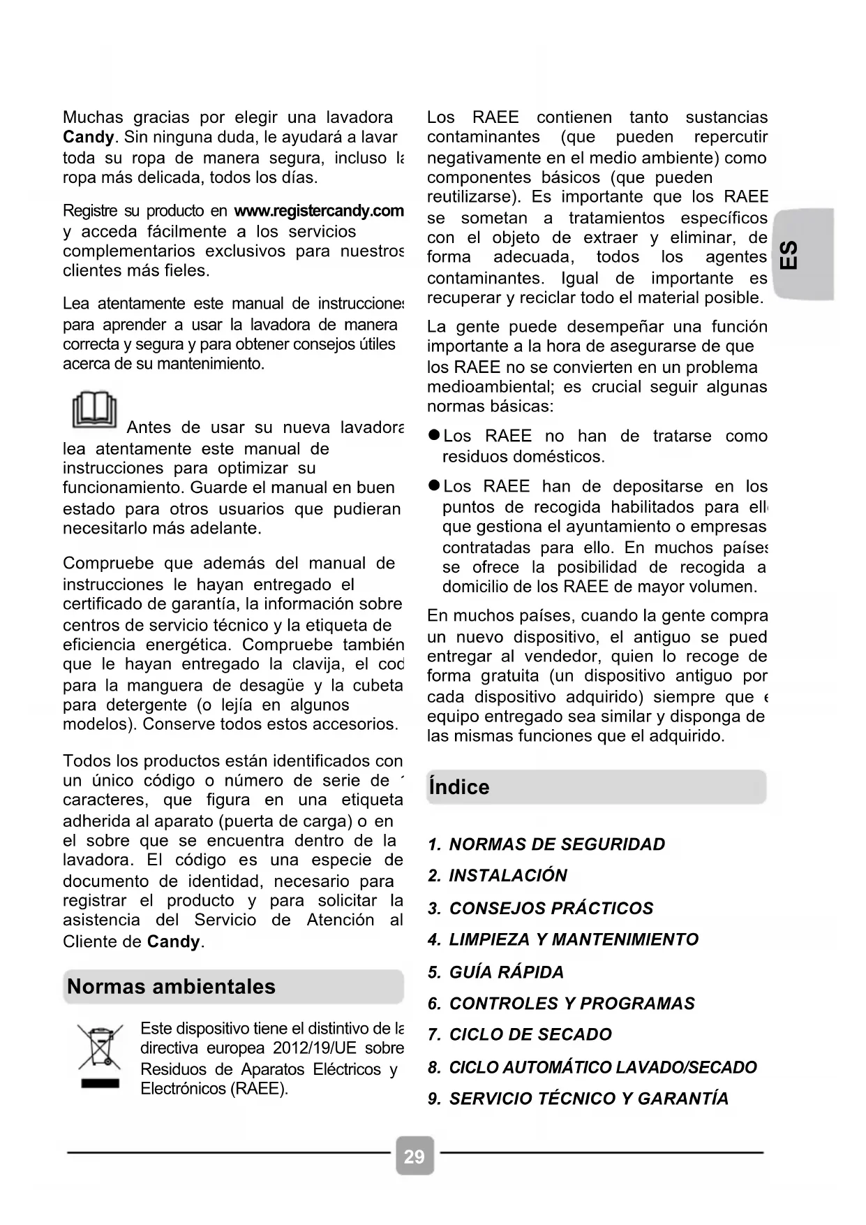 Registre su producto en www.registercandy.com y acceda fácilmente a los servicios complementarios exclusivos para nuestros clientes más fieles. Lea atentamente este manual de instrucciones para aprender a usar la lavadora de manera correcta y segura y para obtener consejos útiles acerca de su mantenimiento. Antes de usar su nueva lavadora, lea atentamente este manual de instrucciones para optimizar su funcionamiento. Guarde el manual en buen estado para otros usuarios que pudieran necesitarlo más adelante. Compruebe que además del manual de instrucciones le hayan entregado el certificado de garantía, la información sobre centros de servicio técnico y la etiqueta de eficiencia energética. Compruebe también que le hayan entregado la clavija, el codo para la manguera de desagüe y la cubeta para detergente (o lejía en algunos modelos). Conserve todos estos accesorios.