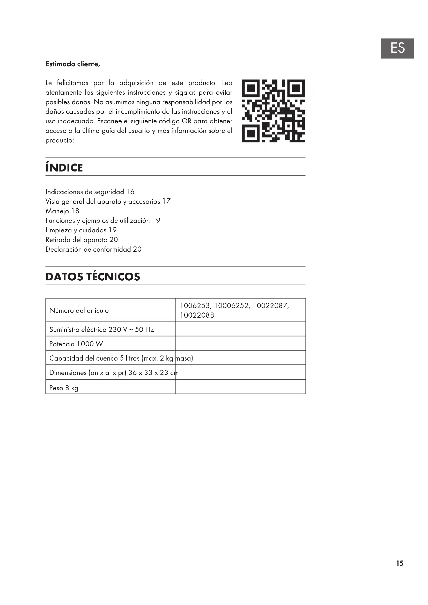 Estimado cliente, Le felicitamos por la adquisición de este producto. Lea atentamente las siguientes instrucciones y sígalas para evitar posibles daños. No asumimos ninguna responsabilidad por los daños causados por el incumplimiento de las instrucciones y el uso inadecuado. Escanee el siguiente código QR para obtener acceso a la última guía del usuario y más información sobre el producto: ÍNDICE Indicaciones de seguridad16 Vista general del aparato y accesorios17 Manejo18 Funciones y ejemplos de utilización 19 Limpieza y cuidados19 Retirada del aparato20 Declaración de conformidad20