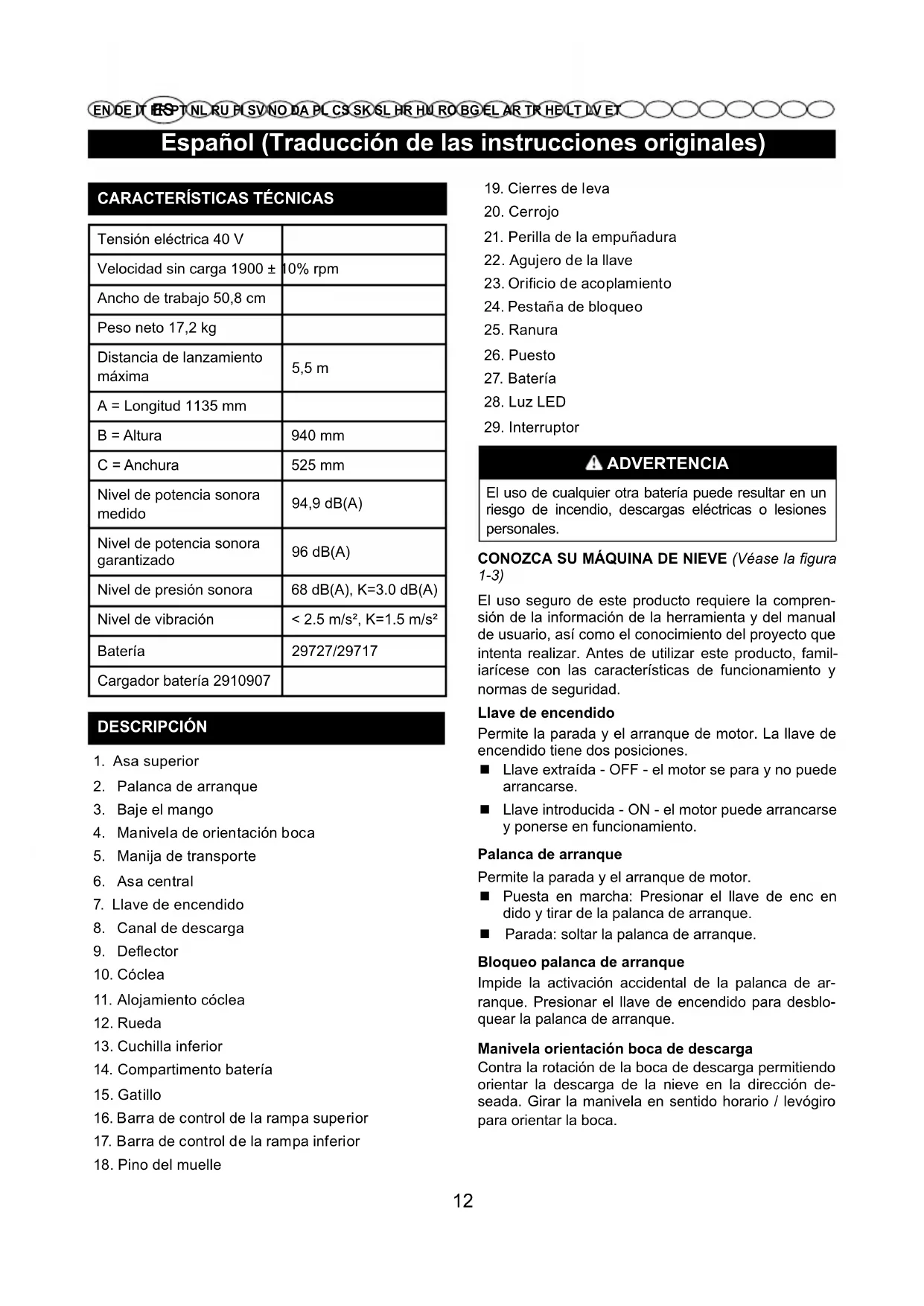 ADVERTENCIA El uso de cualquier otra batería puede resultar en un riesgo de incendio, descargas eléctricas o lesiones personales.CONOZCA SU MÁQUINA DE NIEVE (Véase la figura 1-3) El uso seguro de este producto requiere la compren-sión de la información de la herramienta y del manual de usuario, así como el conocimiento del proyecto que intenta realizar. Antes de utilizar este producto, famil-iarícese con las características de funcionamiento y normas de seguridad.Llave de encendidoPermite la parada y el arranque de motor. La llave de encendido tiene dos posiciones. Llave extraída - OFF - el motor se para y no puede arrancarse. Llave introducida - ON - el motor puede arrancarse y ponerse en funcionamiento.Palanca de arranquePermite la parada y el arranque de motor. Puesta en marcha: Presionar el llave de enc en dido y tirar de la palanca de arranque. Parada: soltar la palanca de arranque.Bloqueo palanca de arranqueImpide la activación accidental de la palanca de ar-ranque. Presionar el llave de encendido para desblo-quear la palanca de arranque.Manivela orientación boca de descargaContra la rotación de la boca de descarga permitiendo orientar la descarga de la nieve en la dirección de-seada. Girar la manivela en sentido horario / levógiro para orientar la boca. 12Español (Traducción de las instrucciones originales)