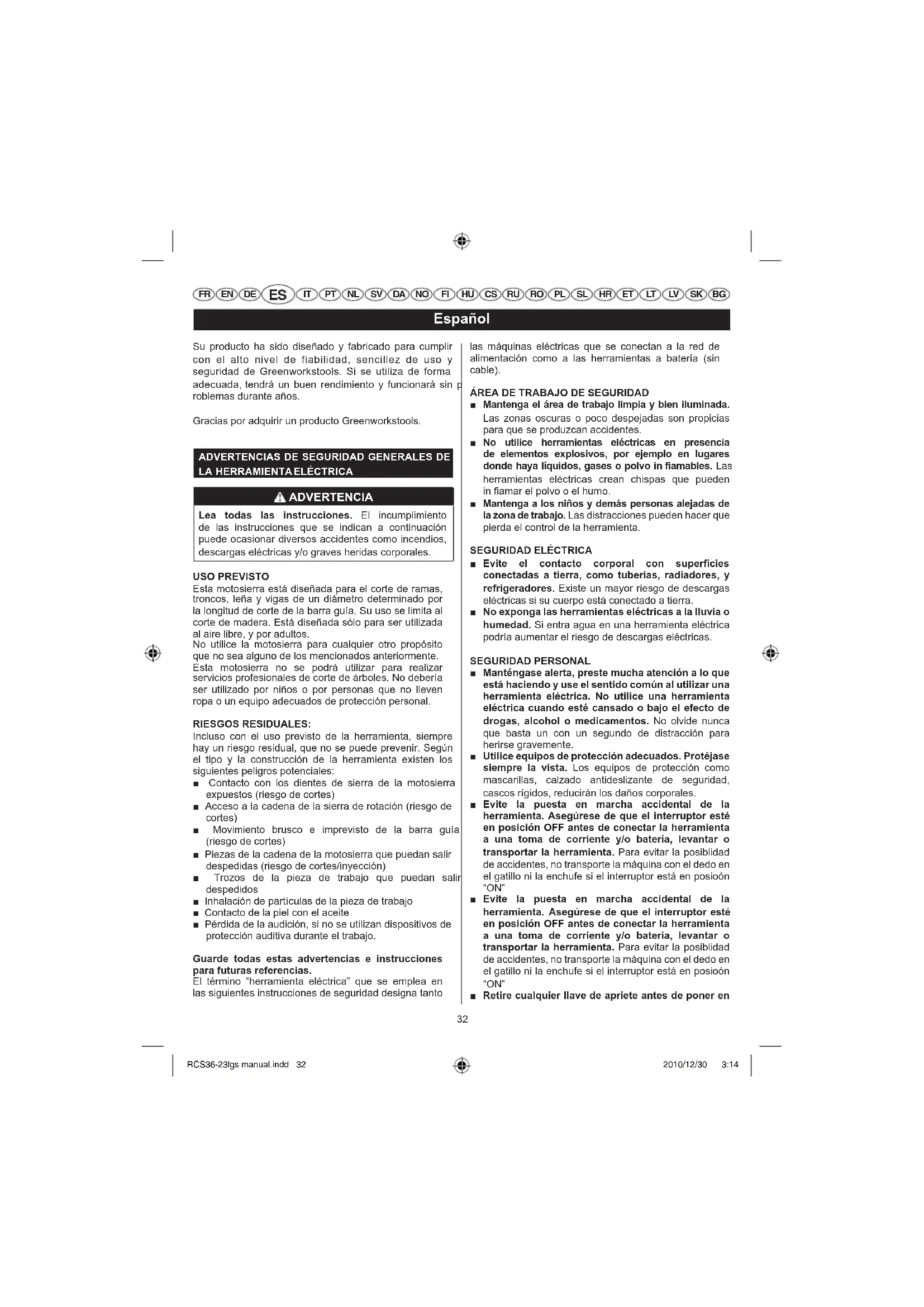 FR EN DE IT PT NL SV DA NO FI HU CS RU RO PL SL HR ET LT LV SK BG Su producto ha sido diseñado y fabricado para cumplir con el alto nivel de fiabilidad, sencillez de uso y seguridad de Greenworkstools. Si se utiliza de forma adecuada, tendrá un buen rendimiento y funcionará sin p roblemas durante años. Gracias por adquirir un producto Greenworkstools.