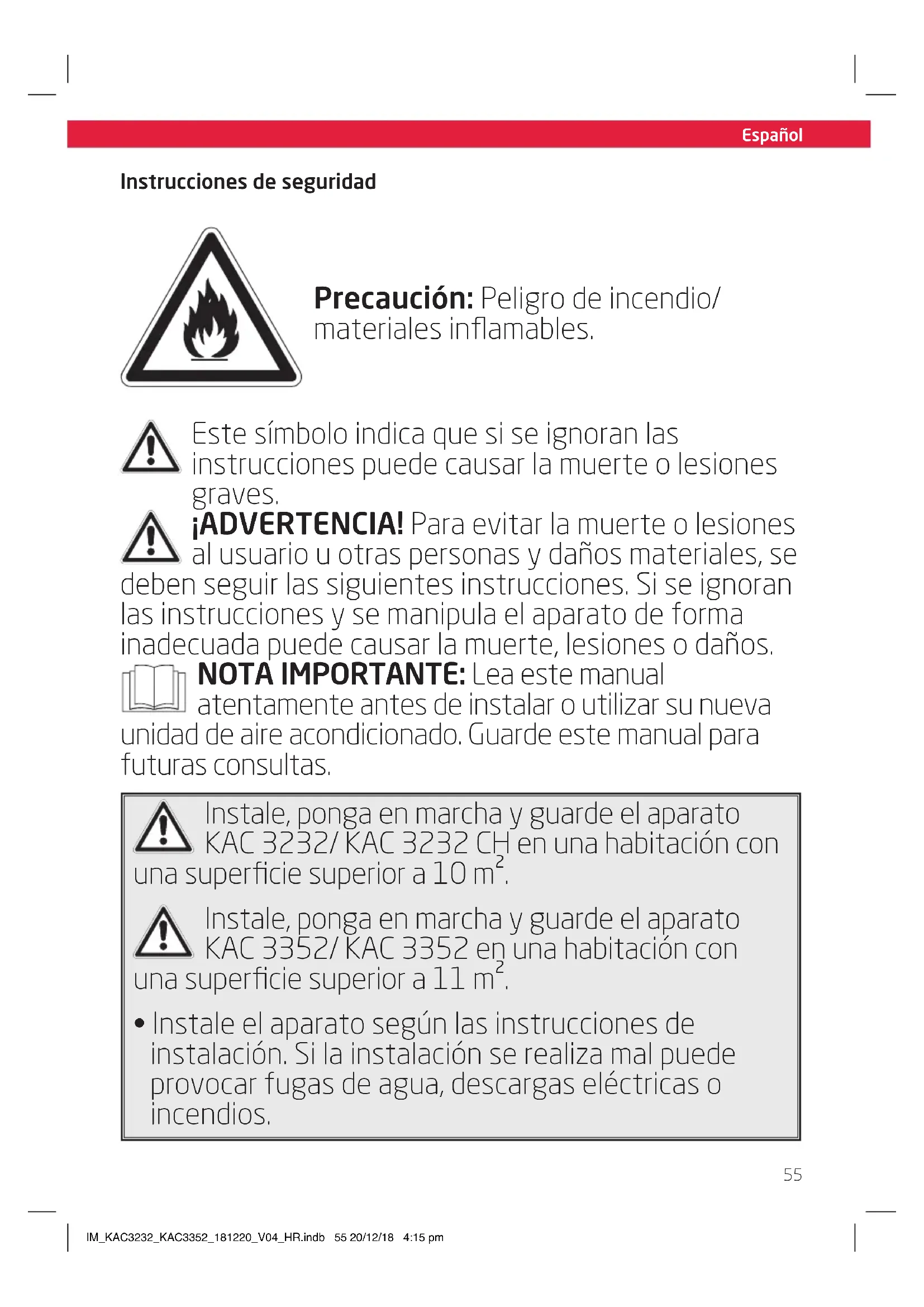 Instrucciones de seguridad Precaución: Peligro de incendio/ materiales inflamables. Este símbolo indica que si se ignoran las instrucciones puede causar la muerte o lesiones graves. ¡ADVERTENCIA! Para evitar la muerte o lesiones al usuario u otras personas y daños materiales, se deben seguir las siguientes instrucciones. Si se ignoran las instrucciones y se manipula el aparato de forma inadecuada puede causar la muerte, lesiones o daños. NOTA IMPORTANTE: Lea este manual atentamente antes de instalar o utilizar su nueva unidad de aire acondicionado. Guarde este manual para futuras consultas. Instale, ponga en marcha y guarde el aparato KAC 3232/ KAC 3232 CH en una habitación con una superficie superior a 10 m². Instale, ponga en marcha y guarde el aparato KAC 3352/ KAC 3352 en una habitación con una superficie superior a 11 m².