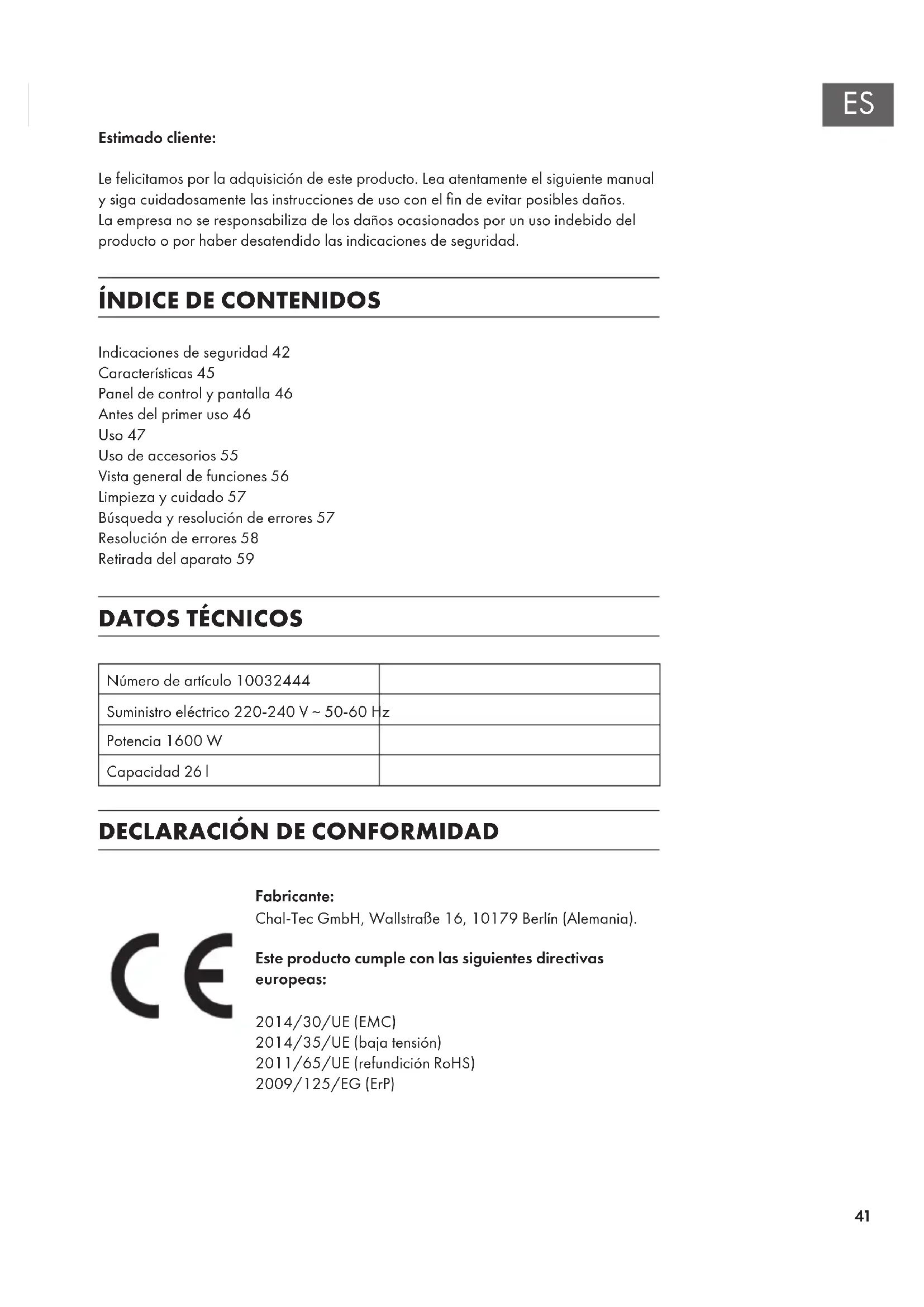 Fabricante: Chal-Tec GmbH, Wallstraße 16, 10179 Berlín (Alemania). Este producto cumple con las siguientes directivas europeas: 2014/30/UE (EMC) 2014/35/UE (baja tensión) 2011/65/UE (refundición RoHS) 2009/125/EG (ErP)42