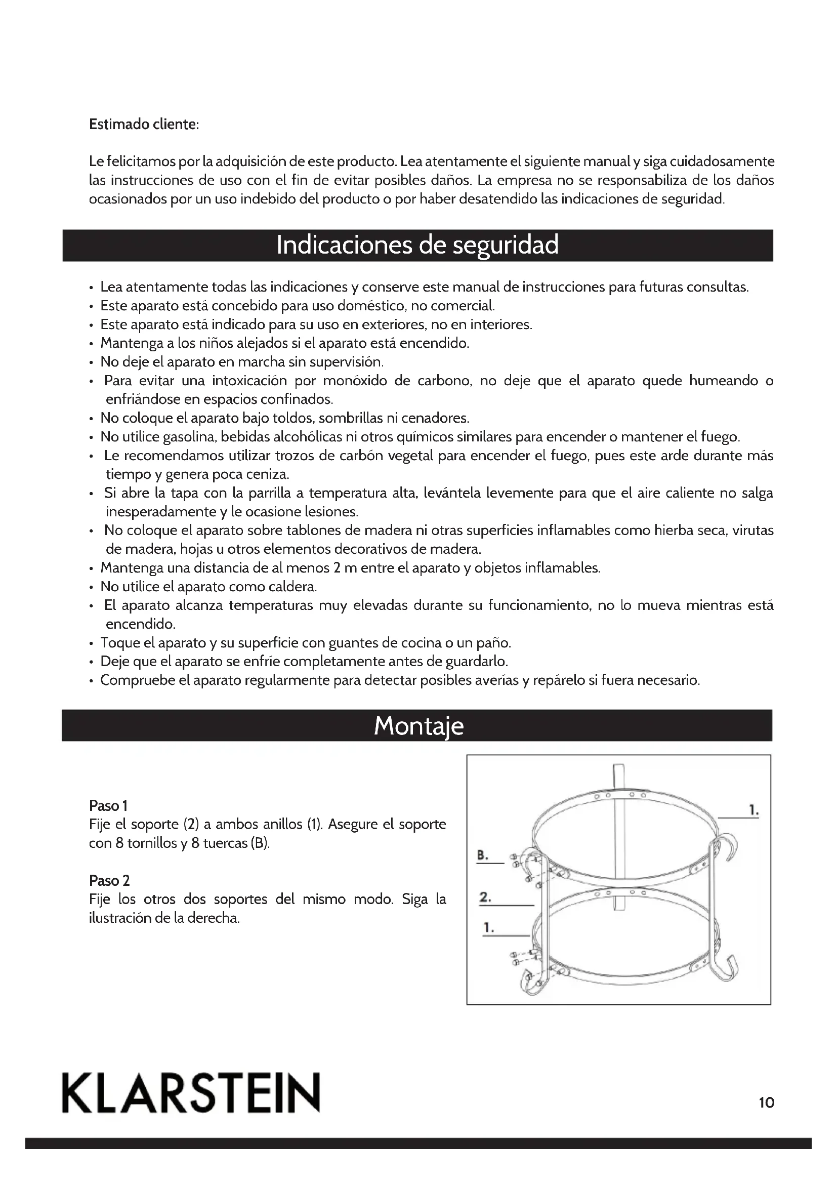 - Compruebe el aparato regularmente para detectar posibles averías y repárelo si fuera necesario. Montaje Paso 1 Fije el soporte (2) a ambos anillos (1). Asegure el soporte con 8 tornillos y 8 tuercas (B). Paso 2 Fije los otros dos soportes del mismo modo. Siga la ilustración de la derecha.11 Paso 3 Levante la tapa del horno y coloque el cajón para las cenizas (5), el recipiente para el carbón (4) y la parrilla (3) dentro de la barbacoa (consulte la ilustración inferior). Vuelva a colocar la tapa. Paso 4 Oriente los orificios del asa a los tornillos preinstalados en la tapa y fíjelos con la ayuda de cuatro tuercas. Siga el mismo procedimiento para el otro asa. Paso 5 Coloque la barbacoa en los soportes de tal manera que el compartimento inferior se oriente hacia adelante y pueda abrirlo y cerrarlo sin problemas. Cuando haya colocado la barbacoa correctamente sobre los soportes, compruebe con un nivel que la superficie de instalación no está inclinada. El horno ya está listo para su uso. Antes de ponerlo en marcha, lea este manual.12 Utilización Apagar el fuego Si desea apagar el fuego, no introduzca más material combustible dentro del horno y cierre todos los orificios de ventilación y la tapa para ahogar el fuego. No utilice agua, podría dañar la cerámica. Mantenimiento Apriete los tornillos con frecuencia y lubrique las bisagras al menos 2 veces al año. Encender el fuego y utilizar la parrilla