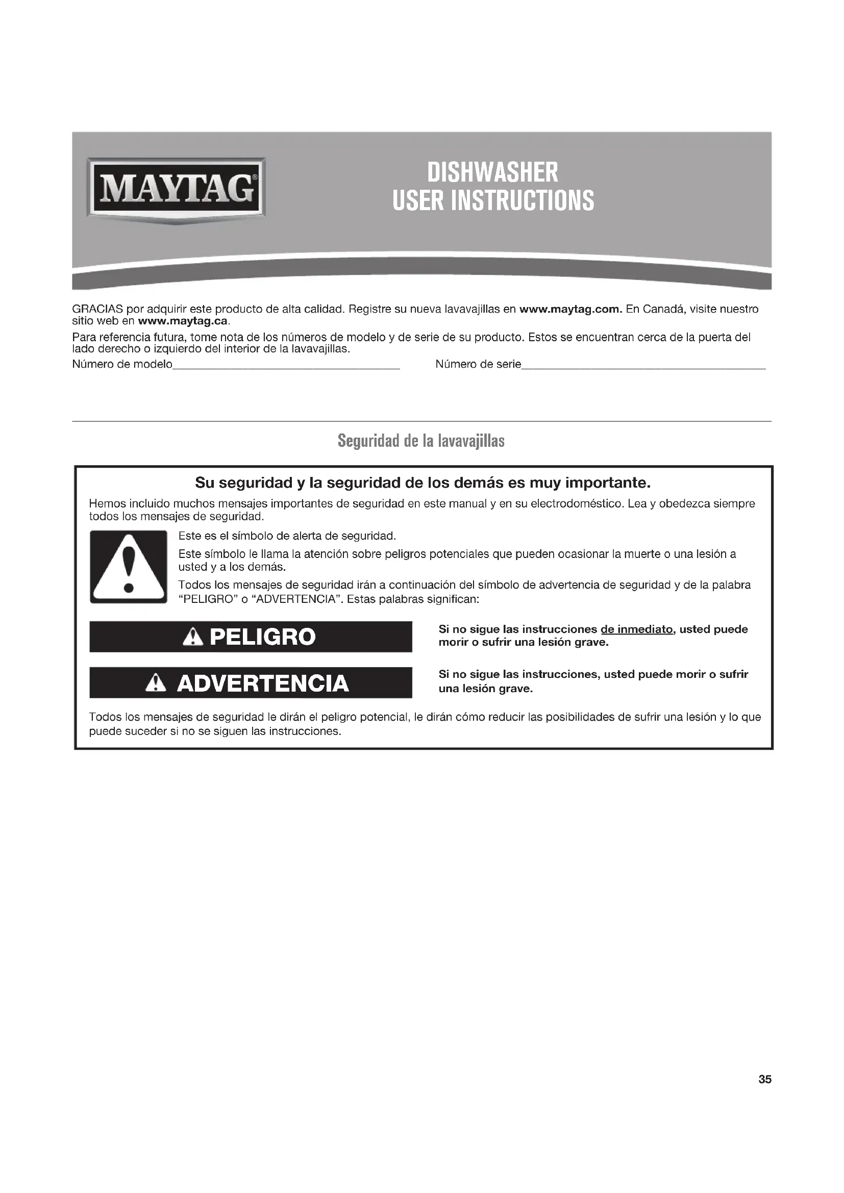 ADJUNTE SU RECIBO AQUÍ. SE REQUIERE UN COMPROBANTE DE COMPRA PARA OBTENER SERVICIO BAJO LA GARANTÍA.Tenga disponible la siguiente información cuando llame al Customer eXperience Center: ■ Nombre, dirección y número de teléfono ■ Número de modelo y de serie ■ Una descripción clara y detallada de problema ■ Comprobante de compra que incluya nombre y dirección del distribuidor o minorista GARANTÍA LIMITADA DE DIEZ AÑOS QUÉ ESTÁ CUBIERTO QUÉ NO ESTÁ CUBIERTO GARANTÍA LIMITADA DURANTE EL PRIMER AÑO (PIEZAS Y MANO DE OBRA)Durante un año a partir de la fecha de compra, siempre y cuando este electrodoméstico principal se instale y se le dé un uso y mantenimiento de conformidad con las instrucciones adjuntas o provistas con el producto, la marca Maytag de Whirlpool Corporation o Whirlpool Canada LP (en lo sucesivo denominado “Maytag”), sehará cargo del costo de las piezas especicadas de fábrica y deltrabajo de reparación para corregir defectos en los materiales oen la mano de obra, existentes en el momento de la compra de esteelectrodoméstico principal o reemplazará, a su entera discreción, elproducto. En caso de reemplazo del producto, su electrodoméstico tendrá garantía durante el plazo restante del período de garantía de launidad original.GARANTÍA LIMITADA DEL SEGUNDO AL DÉCIMO AÑO (SÓLO PARA CIERTAS PIEZAS DE LOS COMPONENTES; NO SE INCLUYE LA MANO DE OBRA)Desde el segundo al décimo año desde la fecha de compra original, siempre y cuando este electrodoméstico principal haya sido instalado, operado y mantenido de acuerdo a las instrucciones adjuntas o provistas con el producto, Maytag pagará por las piezas de repuesto especicadas de fábrica para los siguientes componentes, para corregir defectos no estéticos en los materiales o en la mano de obra de estas piezas, los cuales eviten el funcionamiento del electrodoméstico principal y que hayan existido en el momento de la compra de este electrodoméstico principal. La presente es una garantía limitada de diez años para las piezas nombradas a continuación solamente y no incluye la mano de obra de reparación. ■ Canastas superior e inferior (excluye los estantes para tazas yla canastilla de los cubiertos) ■ Cuchilla de la picadora ■ Cuba de acero inoxidable y revestimiento de la puerta interior.SU ÚNICO Y EXCLUSIVO RECURSO SEGÚN LOS TÉRMINOS DE ESTA GARANTÍA LIMITADA SERÁ EL DE REPARAR EL PRODUCTO SEGÚN SE ESTIPULA EN LA PRESENTE. El servicio deberá ser suministrado por una compañía de servicio designada por Maytag. Esta garantía limitada es válida solamente en Estados Unidos o en Canadá y se aplica solamente cuando el electrodoméstico principal se use en el país en el que se ha comprado. Esta garantía limitada está en vigencia a partir de la fecha de la compra del consumidor original. Se requiere una prueba de la fecha de compra original paraobtener servicio bajo esta garantía limitada.1. El uso comercial, no residencial, multifamiliar, o no consistente con las instrucciones publicadas para el usuario, el operador o lainstalación. 2. Instrucciones provistas en la casa para usar el producto.3. Servicio técnico para corregir mantenimiento o instalación incorrectos del producto, instalación no acorde con los códigos eléctricos o de plomería o corrección de electricidad o plomería dela casa (p. ej. cableado, fusibles o mangueras de entrada de agua en la casa).4. Piezas consumibles (por ejemplo, focos de luz, baterías, ltros de aire o de agua, soluciones conservantes, etc.).5. Defectos o daños causados por piezas o accesorios no genuinos de Maytag.6. Daños causados por accidente, uso indebido, abuso, incendio, inundación, actos fortuitos o uso con productos no aprobados por Maytag.7. Reparaciones de piezas o sistemas para corregir daños o defectos causados por servicio técnico, alteración o modicación no autorizados del electrodoméstico.8. Daños estéticos, incluso arañazos, abolladuras, desportilladuras u otro daño al acabado del electrodoméstico, a menos que se deba a defectos en los materiales o la mano de obra y se informe a Maytag en un lapso de 30 días. 9. Decoloración, herrumbre u óxido de supercies causados por ambientes cáusticos o corrosivos, incluso, entre otras cosas, altas concentraciones de sal, alta humedad o condensación o exposición a sustancias químicas.10. Recogida o entrega. Este producto ha sido diseñado únicamente para ser reparado en la casa.11. Gastos de viajes o transporte para el servicio técnico en lugares remotos donde no haya un proveedor de servicio técnico autorizado de Maytag disponible.12. Retiro o reinstalación de electrodomésticos inaccesibles o componentes integrados (por ejemplo, adornos, paneles decorativos, pisos, gabinetes, islas, encimeras, mampostería, etc.) que intereran con el servicio técnico, el retiro o el reemplazo del producto.13. Servicio técnico o piezas para electrodomésticos con números de modelo/serie originales que se hayan removido, alterado o que no se puedan determinar con facilidad.El costo de la reparación o el reemplazo bajo estas circunstancias excluidas correrá por cuenta del cliente.W11172665A 05/18