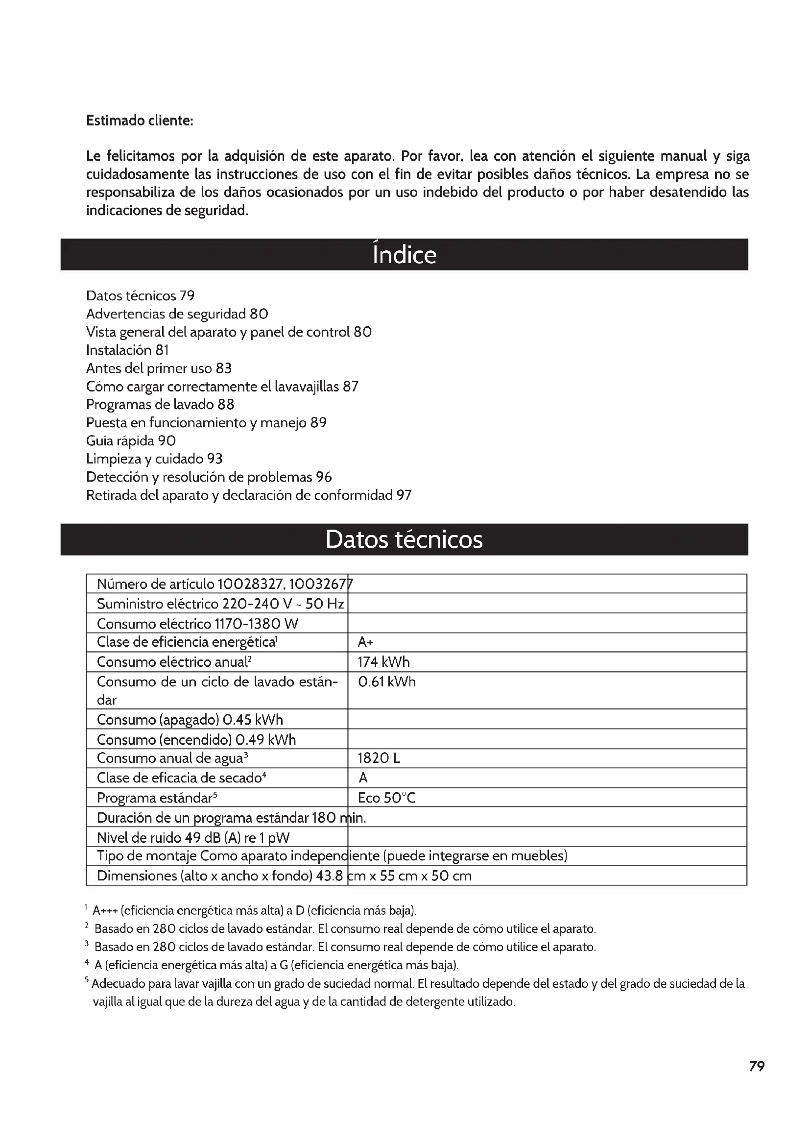 Adecuado para lavar vajilla con un grado de suciedad normal. El resultado depende del estado y del grado de suciedad de la vajilla al igual que de la dureza del agua y de la cantidad de detergente utilizado.80 Advertencias de seguridad Lea atentamente las siguientes advertencias y conserve este manual de instrucciones para consultas posteriores.