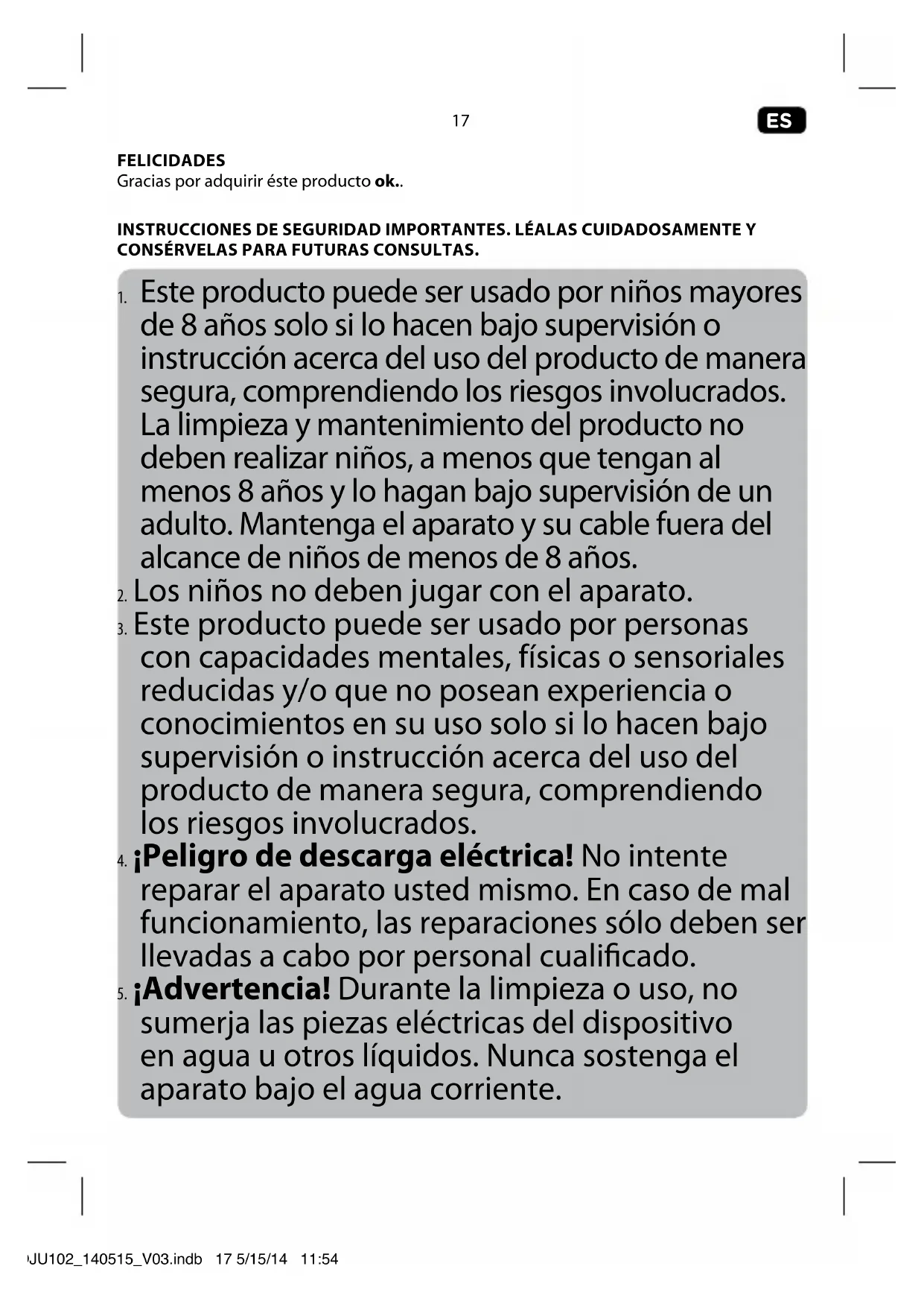 sumerja las piezas eléctricas del dispositivo en agua u otros líquidos. Nunca sostenga el aparato bajo el agua corriente. IM_OJU102_140515_V03.indb 17 5/15/14 11:54 AMES
