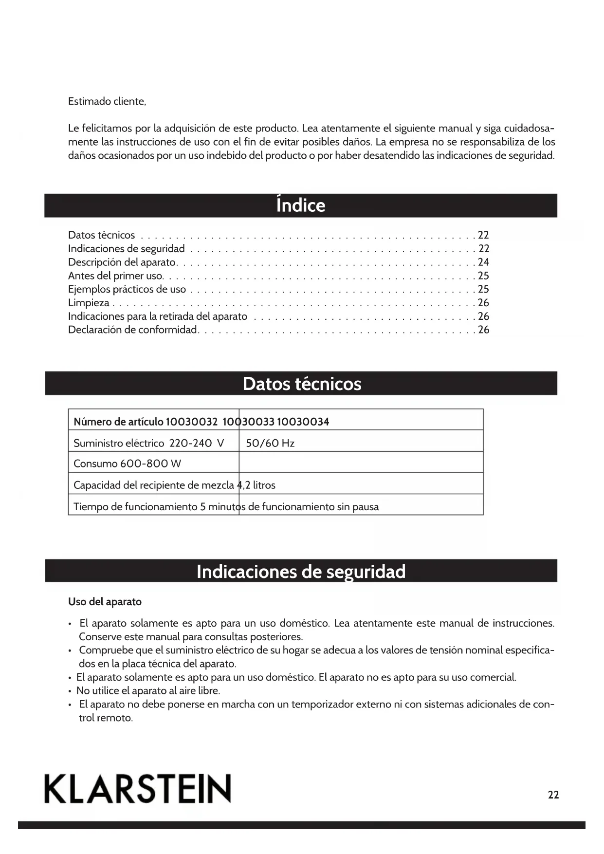- È possibile miscelare per 5 minuti consecutivi.22 Índice Datos técnicos Indicaciones de seguridad Estimado cliente, Le felicitamos por la adquisición de este producto. Lea atentamente el siguiente manual y siga cuidadosa- mente las instrucciones de uso con el fin de evitar posibles daños. La empresa no se responsabiliza de los daños ocasionados por un uso indebido del producto o por haber desatendido las indicaciones de seguridad. Número de artículo 10030032 10030033 10030034 Suministro eléctrico 220-240 V 50/60 Hz Consumo 600-800 W Capacidad del recipiente de mezcla 4,2 litros Tiempo de funcionamiento 5 minutos de funcionamiento sin pausa Datos técnicos . . . . . . . . . . . . . . . . . . . . . . . . . . . . . . . . . . . . . . . . . . . . . . . .22 Indicaciones de seguridad . . . . . . . . . . . . . . . . . . . . . . . . . . . . . . . . . . . . . . . . .22 Descripción del aparato . . . . . . . . . . . . . . . . . . . . . . . . . . . . . . . . . . . . . . . . . . . 24 Antes del primer uso . . . . . . . . . . . . . . . . . . . . . . . . . . . . . . . . . . . . . . . . . . . . . 25 Ejemplos prácticos de uso . . . . . . . . . . . . . . . . . . . . . . . . . . . . . . . . . . . . . . . . . 25 Limpieza . . . . . . . . . . . . . . . . . . . . . . . . . . . . . . . . . . . . . . . . . . . . . . . . . . . . 26 Indicaciones para la retirada del aparato . . . . . . . . . . . . . . . . . . . . . . . . . . . . . . . .26 Declaración de conformidad . . . . . . . . . . . . . . . . . . . . . . . . . . . . . . . . . . . . . . . . 26 Uso del aparato