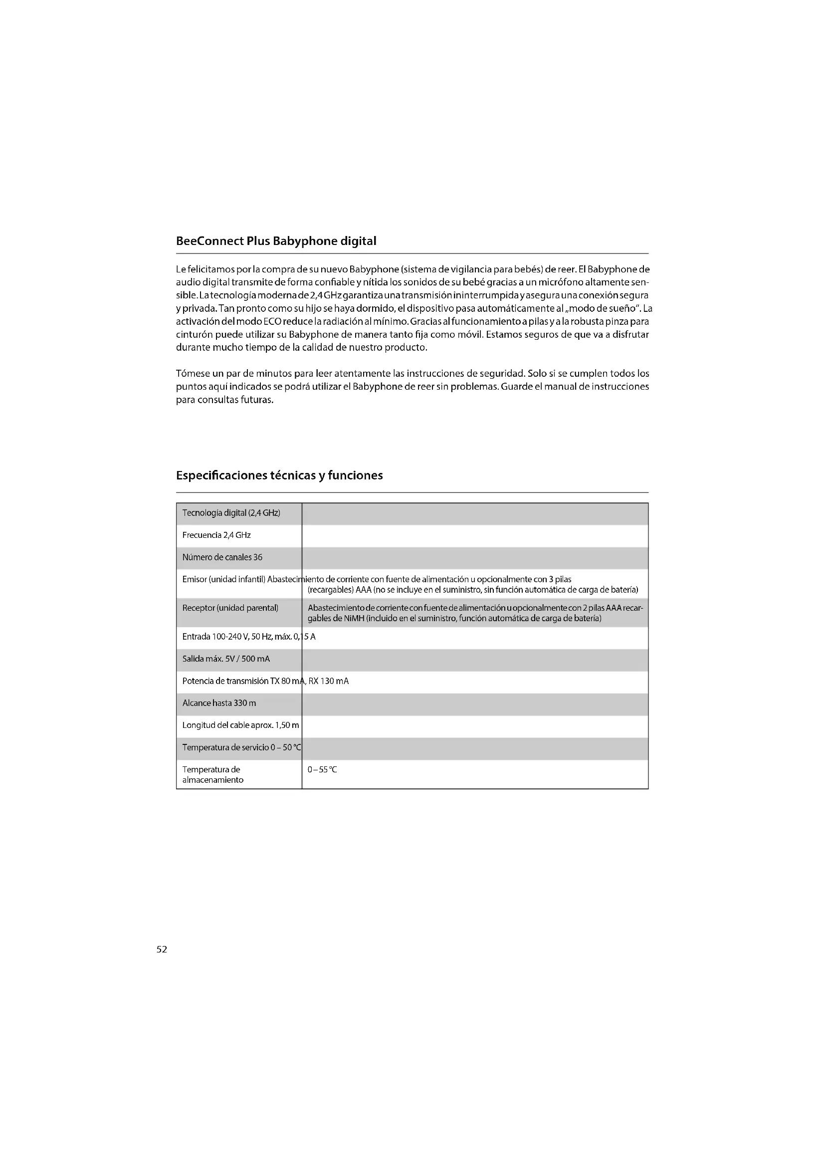 - Parlare nell‘unità bambino, o impostarla brevemente su „Range alarm“. IT52 BeeConnect Plus Babyphone digital Le felicitamos por la compra de su nuevo Babyphone (sistema de vigilancia para bebés) de reer. El Babyphone de audio digital transmite de forma conable y nítida los sonidos de su bebé gracias a un micrófono altamente sen- sible. La tecnología moderna de 2,4 GHz garantiza una transmisión ininterrumpida y asegura una conexión segura y privada. Tan pronto como su hijo se haya dormido, el dispositivo pasa automáticamente al „modo de sueño“. La activación del modo ECO reduce la radiación al mínimo. Gracias al funcionamiento a pilas y a la robusta pinza para cinturón puede utilizar su Babyphone de manera tanto ja como móvil. Estamos seguros de que va a disfrutar durante mucho tiempo de la calidad de nuestro producto. Tómese un par de minutos para leer atentamente las instrucciones de seguridad. Solo si se cumplen todos los puntos aquí indicados se podrá utilizar el Babyphone de reer sin problemas. Guarde el manual de instrucciones para consultas futuras. Tecnología digital (2,4 GHz) Frecuencia 2,4 GHz Número de canales 36 Emisor (unidad infantil) Abastecimiento de corriente con fuente de alimentación u opcionalmente con 3 pilas (recargables) AAA (no se incluye en el suministro, sin función automática de carga de batería) Receptor (unidad parental) Abastecimiento de corriente con fuente de alimentación u opcionalmente con 2 pilas AAA recar- gables de NiMH (incluido en el suministro, función automática de carga de batería) Entrada 100-240 V, 50 Hz, máx. 0,15 A Salida máx. 5V / 500 mA Potencia de transmisión TX 80 mA, RX 130 mA Alcance hasta 330 m Longitud del cable aprox. 1,50 m Temperatura de servicio 0 – 50 °C Temperatura de almacenamiento 0 – 55 °C Especicaciones técnicas y funciones53