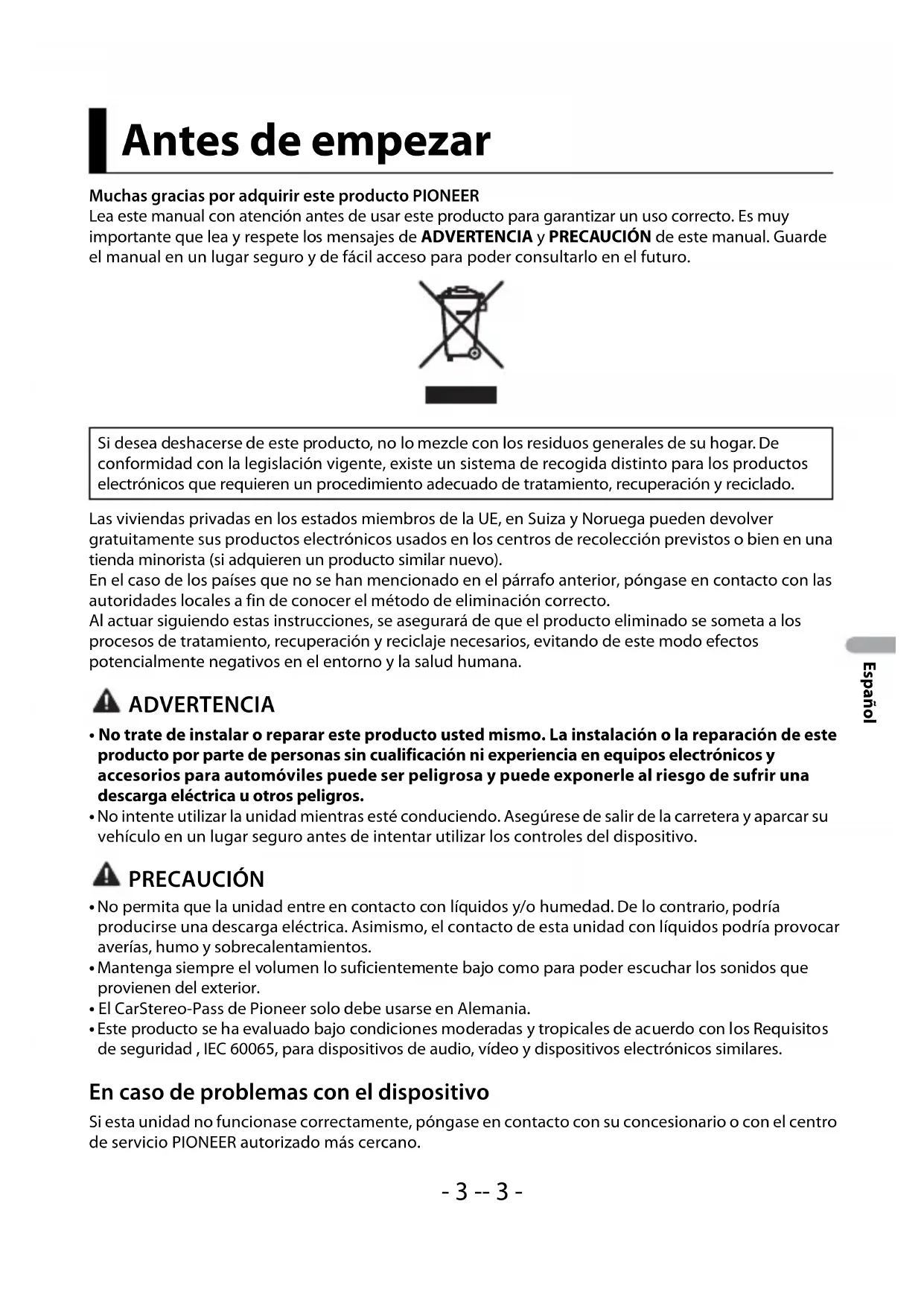 - Este producto se ha evaluado bajo condiciones moderadas y tropicales de acuerdo con los Requisitos de seguridad , IEC 60065, para dispositivos de audio, vídeo y dispositivos electrónicos similares. En caso de problemas con el dispositivo Si esta unidad no funcionase correctamente, póngase en contacto con su concesionario o con el centro de servicio PIONEER autorizado más cercano. Antes de empezar Si desea deshacerse de este producto, no lo mezcle con los residuos generales de su hogar. De conformidad con la legislación vigente, existe un sistema de recogida distinto para los productos electrónicos que requieren un procedimiento adecuado de tratamiento, recuperación y reciclado.- 4 - Español