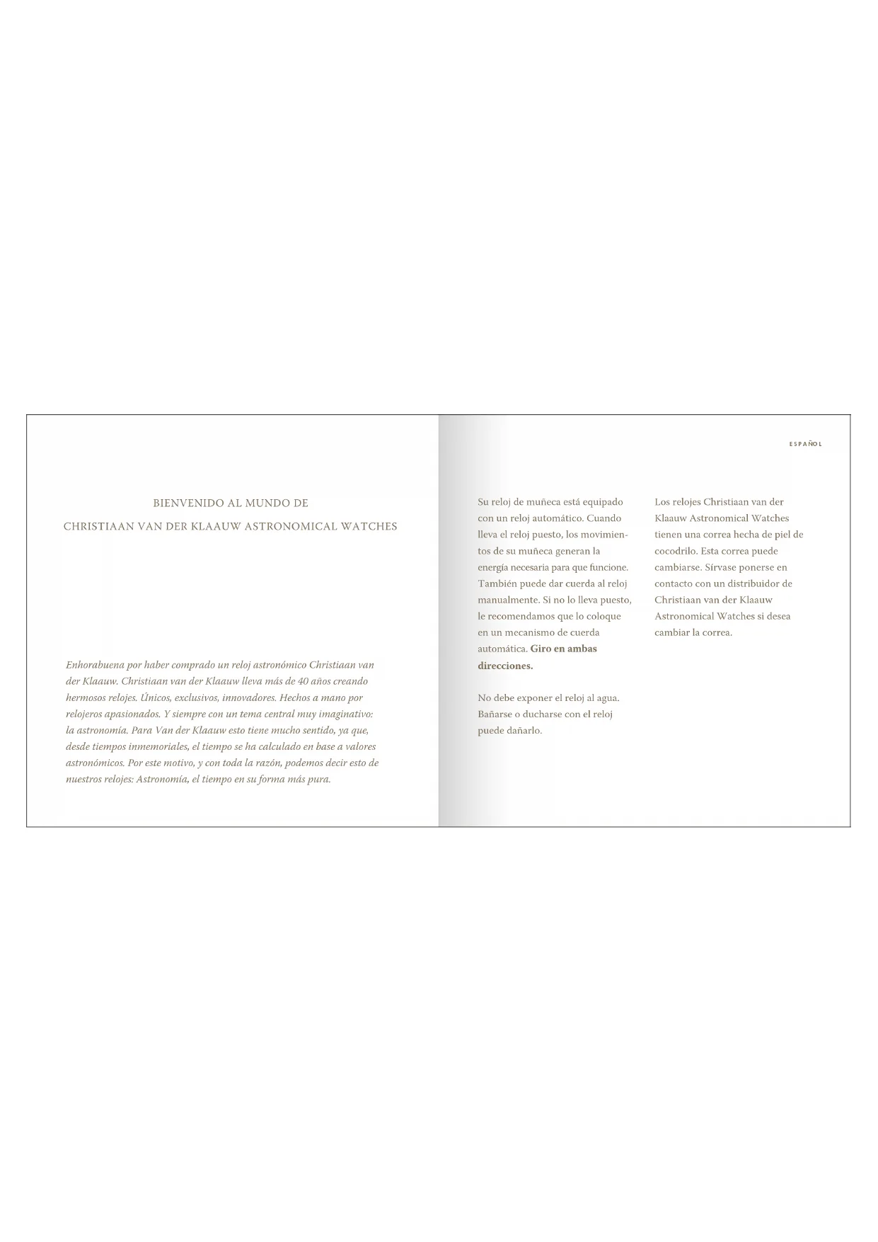 Enhorabuena por haber comprado un reloj astronómico Christiaan van der Klaauw. Christiaan van der Klaauw lleva más de 40 años creando hermosos relojes. Únicos, exclusivos, innovadores. Hechos a mano por relojeros apasionados. Y siempre con un tema central muy imaginativo: la astronomía. Para Van der Klaauw esto tiene mucho sentido, ya que, desde tiempos inmemoriales, el tiempo se ha calculado en base a valores astronómicos. Por este motivo, y con toda la razón, podemos decir esto de nuestros relojes: Astronomía, el tiempo en su forma más pura. Su reloj de muñeca está equipado con un reloj automático. Cuando lleva el reloj puesto, los movimien- tos de su muñeca generan la energía necesaria para que funcione. También puede dar cuerda al reloj manualmente. Si no lo lleva puesto, le recomendamos que lo coloque en un mecanismo de cuerda automática. Giro en ambas direcciones. No debe exponer el reloj al agua. Bañarse o ducharse con el reloj puede dañarlo. Los relojes Christiaan van der Klaauw Astronomical Watches tienen una correa hecha de piel de cocodrilo. Esta correa puede cambiarse. Sírvase ponerse en contacto con un distribuidor de Christiaan van der Klaauw Astronomical Watches si desea cambiar la correa. ESPAÑ OLEspecicaciones La siguiente información aparece en el Retro Moon: