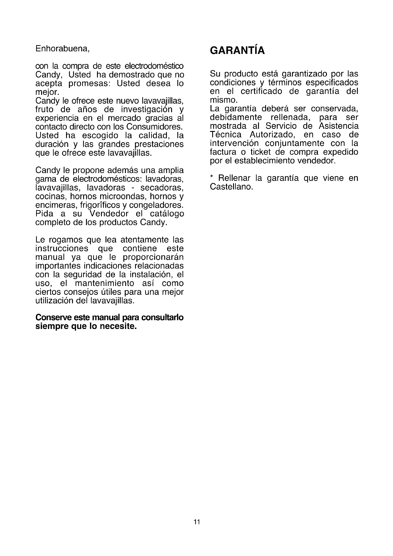 Pulsante “ON/OFF” Pulsante “SELEZIONE PROGRAMMA” Spie “SELEZIONE PROGRAMMA”11 Enhorabuena, con la compra de este electrodoméstico Candy, Usted ha demostrado que no acepta promesas: Usted desea lo mejor. Candy le ofrece este nuevo lavavajillas, fruto de años de investigación y experiencia en el mercado gracias al contacto directo con los Consumidores. Usted ha escogido la calidad, la duración y las grandes prestaciones que le ofrece este lavavajillas. Candy le propone además una amplia gama de electrodomésticos: lavadoras, lavavajillas, lavadoras - secadoras, cocinas, hornos microondas, hornos y encimeras, frigorîficos y congeladores. Pida a su Vendedor el catálogo completo de los productos Candy. Le rogamos que lea atentamente las instrucciones que contiene este manual ya que le proporcionarán importantes indicaciones relacionadas con la seguridad de la instalación, el uso, el mantenimiento así como ciertos consejos útiles para una mejor utilización del lavavajillas. Conserve este manual para consultarlo siempre que lo necesite. GARANTÍA Su producto está garantizado por las condiciones y términos especificados en el certificado de garantía del mismo. La garantía deberá ser conservada, debidamente rellenada, para ser mostrada al Servicio de Asistencia Técnica Autorizado, en caso de intervención conjuntamente con la factura o ticket de compra expedido por el establecimiento vendedor.