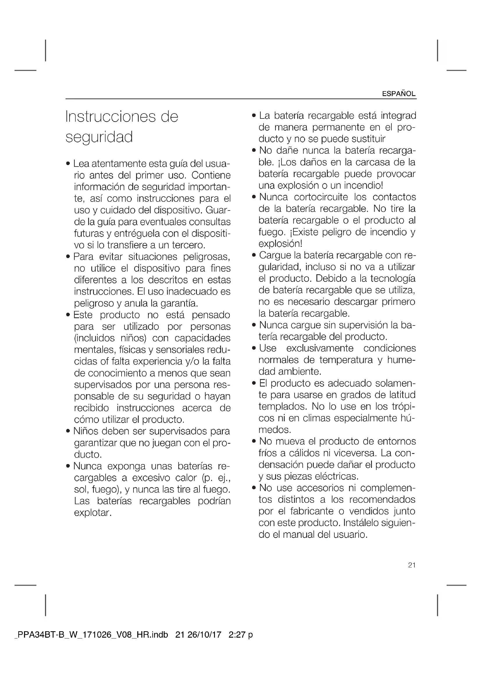 - Si el producto presenta daños, no lo use más y haga que lo repare un técnico cualificado, o póngase en contacto con nuestro departamento de servicio al cliente. No desmonte el producto y no trate de repararlo usted mismo. IM_PPA34BT-B_W_171026_V08_HR.indb 22 26/10/17 2:27 pm23 ESPAÑOL Uso previsto El producto está diseñado solo para la reproducción de sonido y la recep- ción de llamadas telefónicas a través de Bluetooth