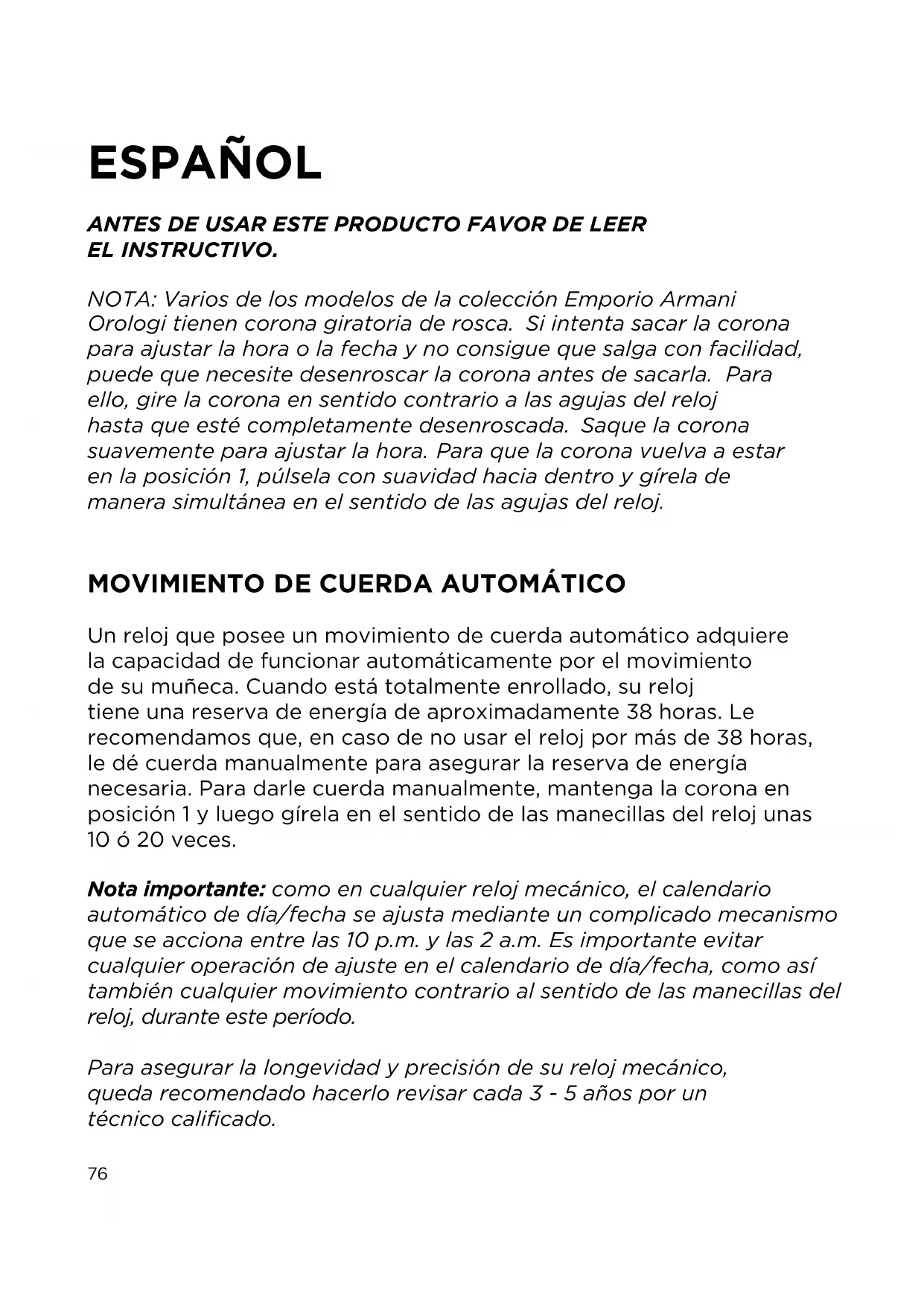 Nota importante: como en cualquier reloj mecánico, el calendario automático de día/fecha se ajusta mediante un complicado mecanismo que seonia entre las 10 p.m. y las 2 a.m. Es importante evitar cualquier operación de ajuste en el calendario de día/fecha, como así también cualquier movimiento contrario al sentido de las manecillas del reloj, durante este periodo.