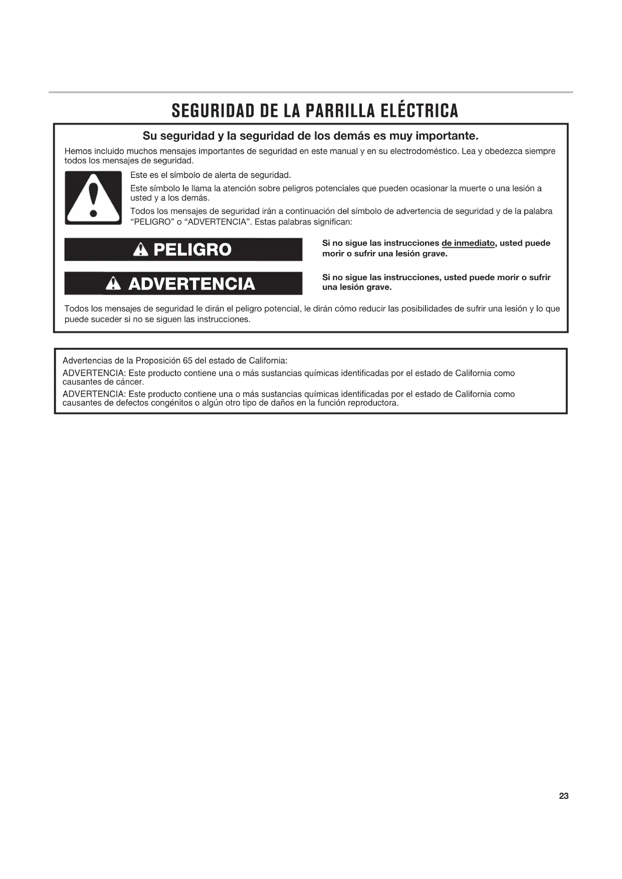 Si no sigue las instrucciones de inmediato, usted puede morir o sufrir una lesión grave. Si no sigue las instrucciones, usted puede morir o sufrir una lesión grave. Todos los mensajes de seguridad le dirán el peligro potencial, le dirán cómo reducir las posibilidades de sufrir una lesión y lo que puede suceder si no se siguen las instrucciones. Su seguridad y la seguridad de los demás es muy importante. Hemos incluido muchos mensajes importantes de seguridad en este manual y en su electrodoméstico. Lea y obedezca siempre todos los mensajes de seguridad. ADVERTENCIA PELIGRO Este es el símbolo de alerta de seguridad. Este símbolo le llama la atención sobre peligros potenciales que pueden ocasionar la muerte o una lesión a usted y a los demás. Todos los mensajes de seguridad irán a continuación del símbolo de advertencia de seguridad y de la palabra “PELIGRO” o “ADVERTENCIA”. Estas palabras significan: Advertencias de la Proposición 65 del estado de California: ADVERTENCIA: Este producto contiene una o más sustancias químicas identificadas por el estado de California como causantes de cáncer. ADVERTENCIA: Este producto contiene una o más sustancias químicas identificadas por el estado de California como causantes de defectos congénitos o algún otro tipo de daños en la función reproductora.24