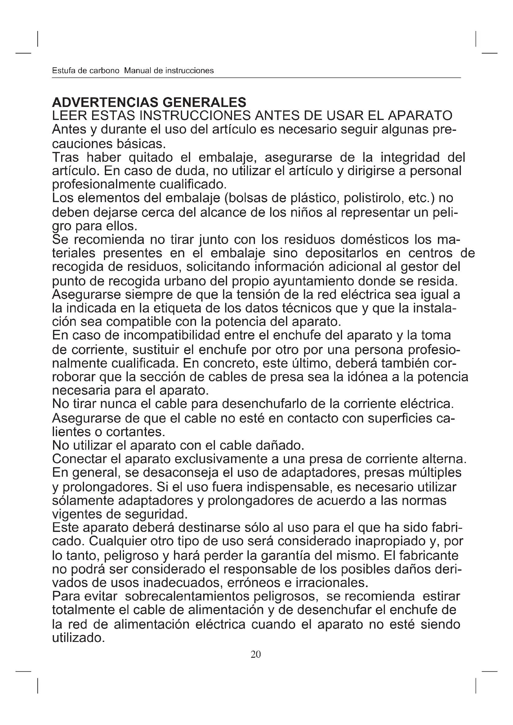 Estufa de carbono Manual de instrucciones ADVERTENCIAS GENERALES LEER ESTAS INSTRUCCIONES ANTES DE USAR EL APARATO Antes y durante el uso del artículo es necesario seguir algunas pre- cauciones básicas. Tras haber quitado el embalaje, asegurarse de la integridad del artículo. En caso de duda, no utilizar el artículo y dirigirse a personal profesionalmente cualicado. Los elementos del embalaje (bolsas de plástico, polistirolo, etc.) no deben dejarse cerca del alcance de los niños al representar un peli- gro para ellos. Se recomienda no tirar junto con los residuos domésticos los ma- teriales presentes en el embalaje sino depositarlos en centros de recogida de residuos, solicitando información adicional al gestor del punto de recogida urbano del propio ayuntamiento donde se resida. Asegurarse siempre de que la tensión de la red eléctrica sea igual a la indicada en la etiqueta de los datos técnicos que y que la instala- ción sea compatible con la potencia del aparato. En caso de incompatibilidad entre el enchufe del aparato y la toma de corriente, sustituir el enchufe por otro por una persona profesio- nalmente cualicada. En concreto, este último, deberá también cor- roborar que la sección de cables de presa sea la idónea a la potencia necesaria para el aparato. No tirar nunca el cable para desenchufarlo de la corriente eléctrica. Asegurarse de que el cable no esté en contacto con supercies ca- lientes o cortantes. No utilizar el aparato con el cable dañado. Conectar el aparato exclusivamente a una presa de corriente alterna. En general, se desaconseja el uso de adaptadores, presas múltiples y prolongadores. Si el uso fuera indispensable, es necesario utilizar sólamente adaptadores y prolongadores de acuerdo a las normas vigentes de seguridad. Este aparato deberá destinarse sólo al uso para el que ha sido fabri- cado. Cualquier otro tipo de uso será considerado inapropiado y, por lo tanto, peligroso y hará perder la garantía del mismo. El fabricante no podrá ser considerado el responsable de los posibles daños deri- vados de usos inadecuados, erróneos e irracionales. Para evitar sobrecalentamientos peligrosos, se recomienda estirar totalmente el cable de alimentación y de desenchufar el enchufe de la red de alimentación eléctrica cuando el aparato no esté siendo utilizado.21 Estufa de carbono Manual de instrucciones