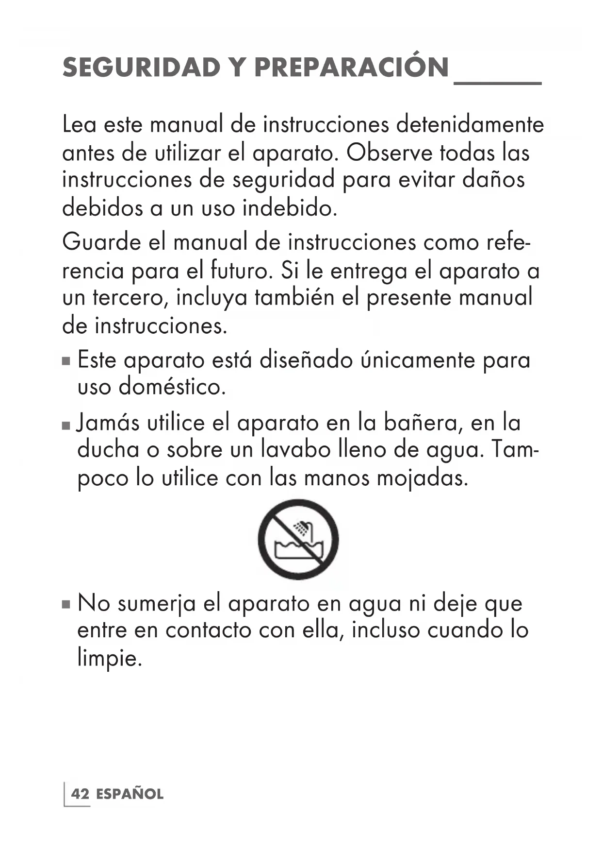 Jamás utilice el aparato en la bañera, en la ducha o sobre un lavabo lleno de agua. Tam- poco lo utilice con las manos mojadas.