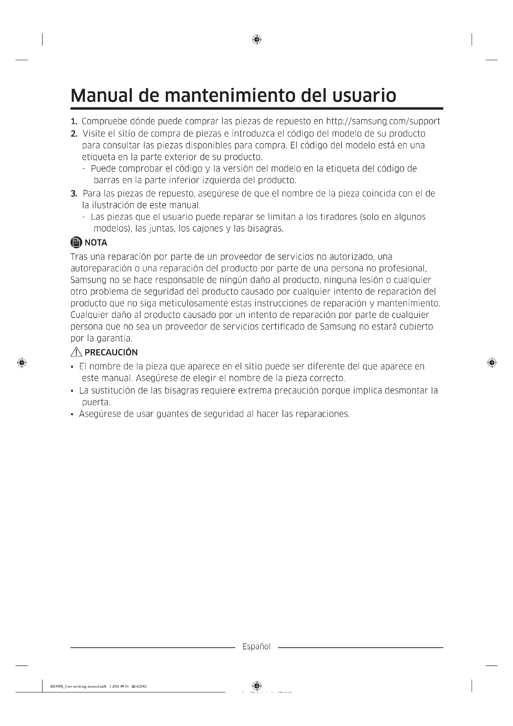 la ilustración de este manual. - Las piezas que el usuario puede reparar se limitan a los tiradores (solo en algunos modelos), las juntas, los cajones y las bisagras. NOTA Tras una reparación por parte de un proveedor de servicios no autorizado, una autoreparación o una reparación del producto por parte de una persona no profesional, Samsung no se hace responsable de ningún daño al producto, ninguna lesión o cualquier otro problema de seguridad del producto causado por cualquier intento de reparación del producto que no siga meticulosamente estas instrucciones de reparación y mantenimiento. Cualquier daño al producto causado por un intento de reparación por parte de cualquier persona que no sea un proveedor de servicios certicado de Samsung no estará cubierto por la garantía. PRECAUCIÓN