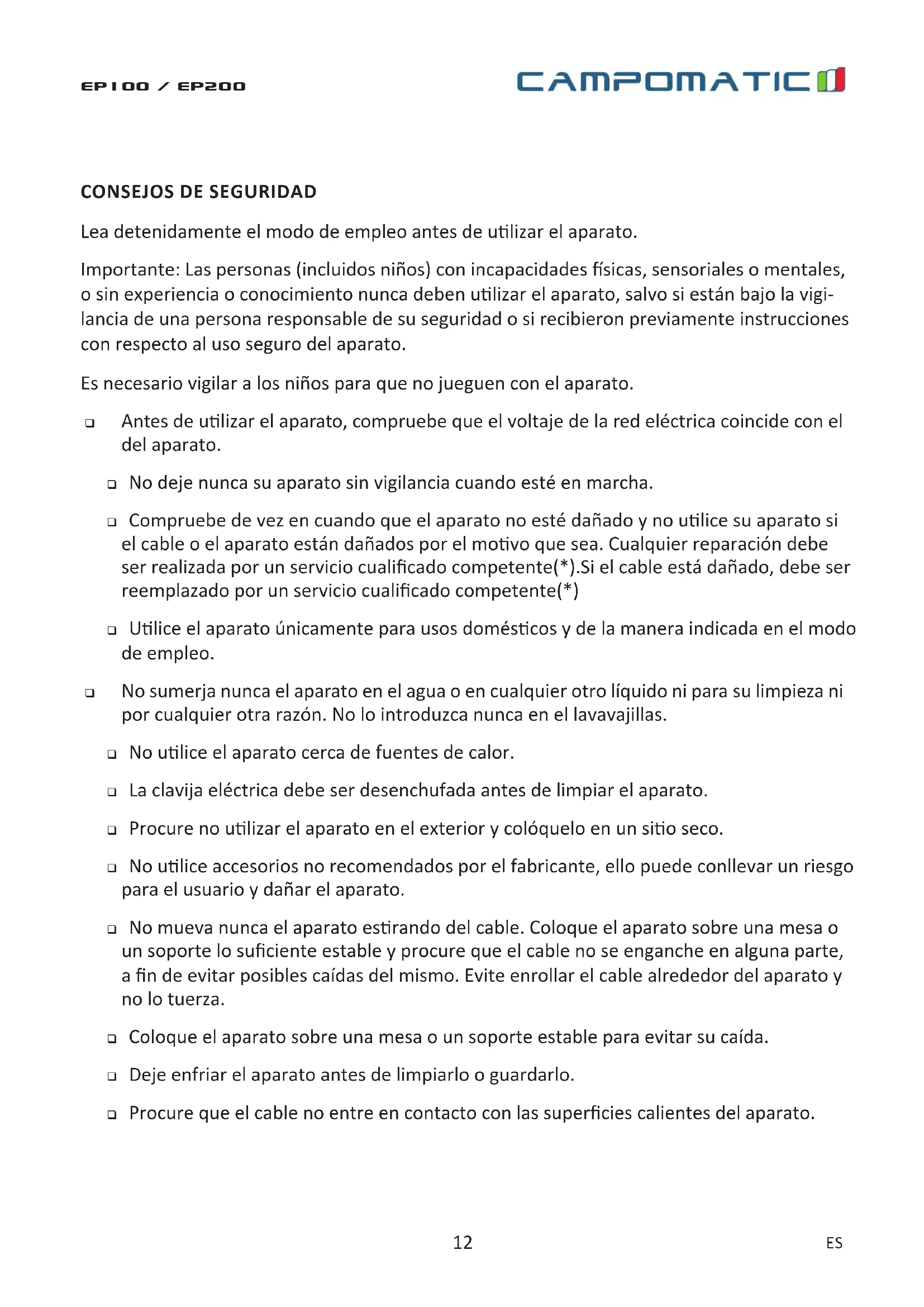Encuentra gratis el manual del aparato EP200 Campomatic en formato PDF.