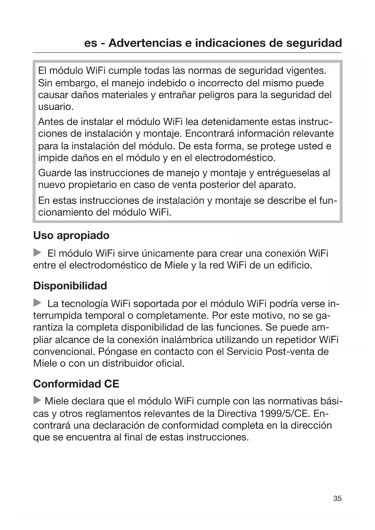 El módulo WiFi cumple todas las normas de seguridad vigentes. Sin embargo, el manejo indebido o incorrecto del mismo puede causar daños materiales y entrañar peligros para la seguridad del usuario. Antes de instalar el módulo WiFi lea detenidamente estas instruc- ciones de instalación y montaje. Encontrará información relevante para la instalación del módulo. De esta forma, se protege usted e impide daños en el módulo y en el electrodoméstico. Guarde las instrucciones de manejo y montaje y entrégueselas al nuevo propietario en caso de venta posterior del aparato. En estas instrucciones de instalación y montaje se describe el fun- cionamiento del módulo WiFi. Uso apropiado El módulo WiFi sirve únicamente para crear una conexión WiFi entre el electrodoméstico de Miele y la red WiFi de un edificio. Disponibilidad La tecnología WiFi soportada por el módulo WiFi podría verse in- terrumpida temporal o completamente. Por este motivo, no se ga- rantiza la completa disponibilidad de las funciones. Se puede am- pliar alcance de la conexión inalámbrica utilizando un repetidor WiFi convencional. Póngase en contacto con el Servicio Post-venta de Miele o con un distribuidor oficial. Conformidad CE Miele declara que el módulo WiFi cumple con las normativas bási- cas y otros reglamentos relevantes de la Directiva 1999/5/CE. En- contrará una declaración de conformidad completa en la dirección que se encuentra al final de estas instrucciones.es - Advertencias e indicaciones de seguridad
