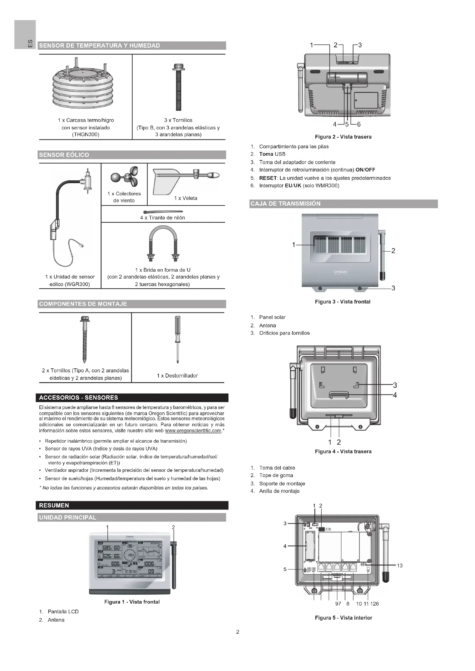 - Repetidor inalámbrico (permite ampliar el alcance de transmisión)• Sensor de rayos UVA (índice y dosis de rayos UVA)• Sensor de radiación solar (Radiación solar, índice de temperatura/humedad/sol/viento y evapotranspiración (ET))• Ventilador aspirador (Incrementa la precisión del sensor de temperatura/humedad)• Sensor de suelo/hojas (Humedad/temperatura del suelo y humedad de las hojas)* No todas las funciones y accesorios estarán disponibles en todos los países. RESUMEN UNIDAD PRINCIPAL