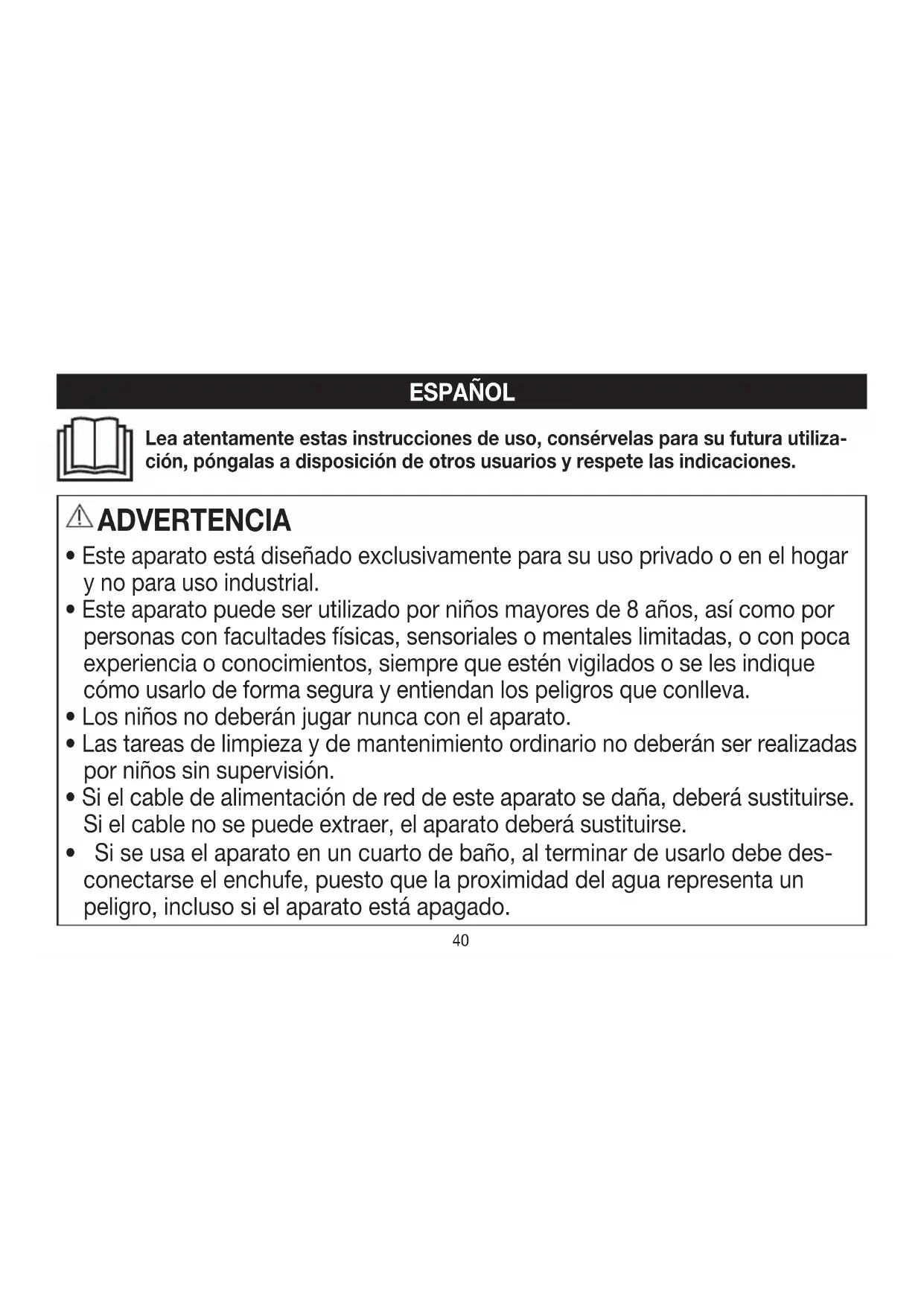 - Si se usa el aparato en un cuarto de baño, al terminar de usarlo debe des- conectarse el enchufe, puesto que la proximidad del agua representa un peligro, incluso si el aparato está apagado. Lea atentamente estas instrucciones de uso, consérvelas para su futura utiliza- ción, póngalas a disposición de otros usuarios y respete las indicaciones.41