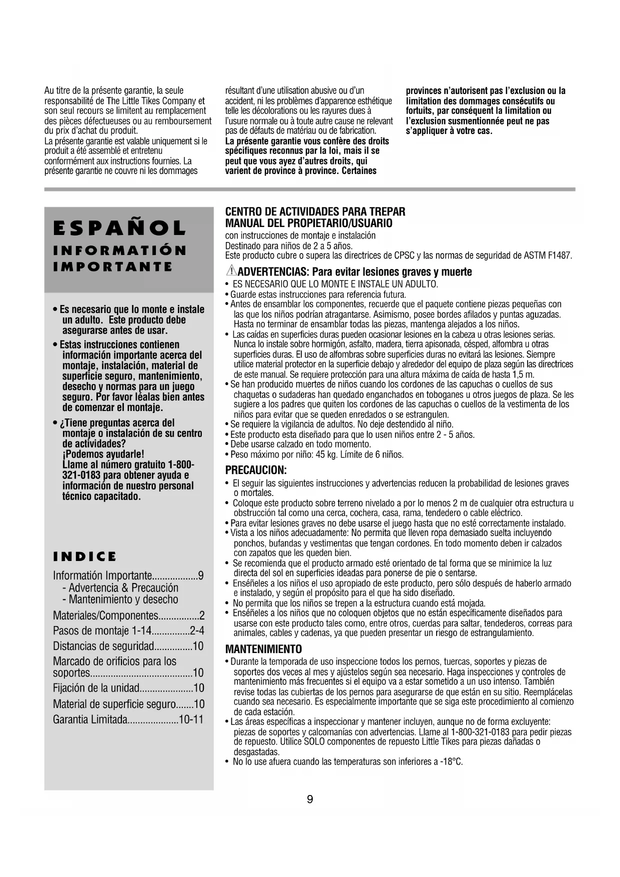 - No lo use afuera cuando las temperaturas son inferiores a -18°C. INDICE Informatión Importante..................9 - Advertencia & Precaución - Mantenimiento y desecho Materiales/Componentes................2 Pasos de montaje 1-14...............2-4 Distancias de seguridad...............10 Marcado de orificios para los soportes........................................10 Fijación de la unidad.....................10 Material de superficie seguro.......10 Garantia Limitada....................10-11 Au titre de la présente garantie, la seule responsabilité de The Little Tikes Company et son seul recours se limitent au remplacement des pièces défectueuses ou au remboursement du prix d’achat du produit. La présente garantie est valable uniquement si le produit a été assemblé et entretenu conformément aux instructions fournies. La présente garantie ne couvre ni les dommages résultant d’une utilisation abusive ou d’un accident, ni les problèmes d’apparence esthétique telle les décolorations ou les rayures dues à l’usure normale ou à toute autre cause ne relevant pas de défauts de matériau ou de fabrication. La présente garantie vous confère des droits spécifiques reconnus par la loi, mais il se peut que vous ayez d’autres droits, qui varient de province à province. Certaines provinces n’autorisent pas l’exclusion ou la limitation des dommages consécutifs ou fortuits, par conséquent la limitation ou l’exclusion susmentionnée peut ne pas s’appliquer à votre cas.10 DESECHO