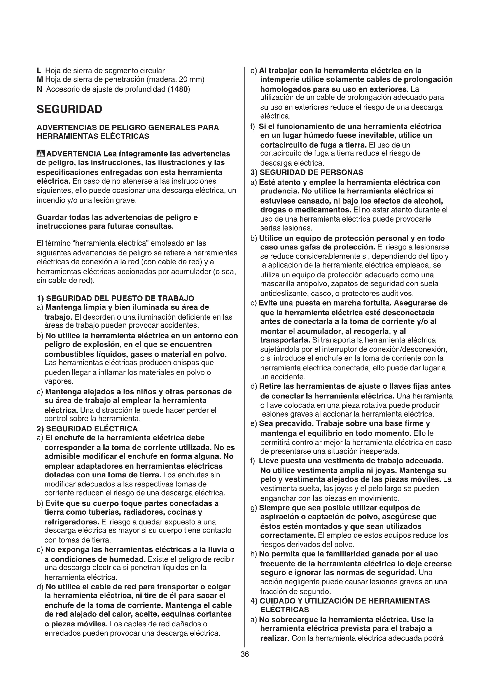 A Llave hexagonal B Alojamiento para la llave hexagonal C Tornillo de sujeción con arandela D Plataforma de lijado E Hoja de lija F Empuñadura auxiliar (1480) G Dispositivo de extracción de polvo H Interruptor de activación/desactivación J Rueda de selección de la velocidad K Ranuras de ventilación36 L Hoja de sierra de segmento circular M Hoja de sierra de penetración (madera, 20 mm) N Accesorio de ajuste de profundidad (1480) SEGURIDAD