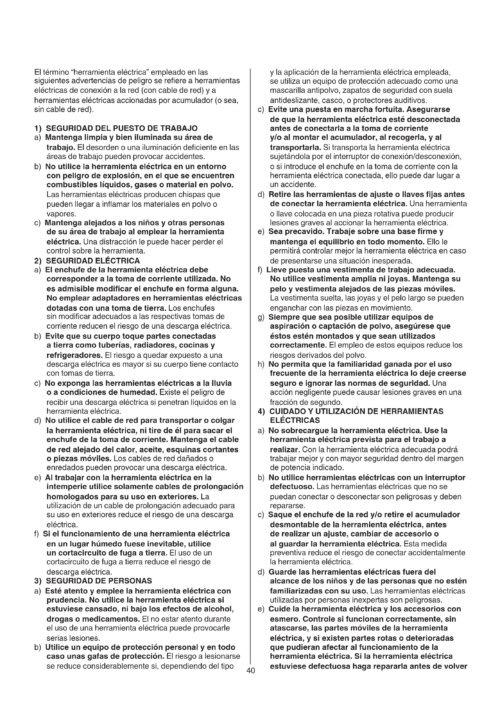 ELÉCTRICAS a) No sobrecargue la herramienta eléctrica. Use la herramienta eléctrica prevista para el trabajo a realizar. Con la herramienta eléctrica adecuada podrá trabajar mejor y con mayor seguridad dentro del margen de potencia indicado. b) No utilice herramientas eléctricas con un interruptor defectuoso. Las herramientas eléctricas que no se puedan conectar o desconectar son peligrosas y deben repararse. c) Saque el enchufe de la red y/o retire el acumulador desmontable de la herramienta eléctrica, antes de realizar un ajuste, cambiar de accesorio o al guardar la herramienta eléctrica. Esta medida preventiva reduce el riesgo de conectar accidentalmente la herramienta eléctrica. d) Guarde las herramientas eléctricas fuera del alcance de los niños y de las personas que no estén familiarizadas con su uso. Las herramientas eléctricas utilizadas por personas inexpertas son peligrosas. e) Cuide la herramienta eléctrica y los accesorios con esmero. Controle si funcionan correctamente, sin atascarse, las partes móviles de la herramienta eléctrica, y si existen partes rotas o deterioradas que pudieran afectar al funcionamiento de la herramienta eléctrica. Si la herramienta eléctrica estuviese defectuosa haga repararla antes de volver El término “herramienta eléctrica” empleado en las siguientes advertencias de peligro se reere a herramientas eléctricas de conexión a la red (con cable de red) y a herramientas eléctricas accionadas por acumulador (o sea, sin cable de red).