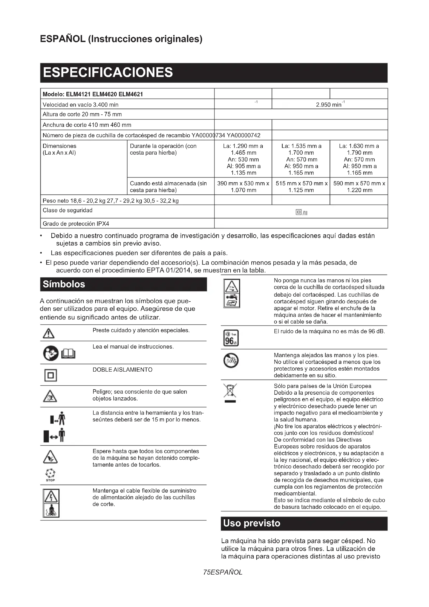 - El peso puede variar dependiendo del accesorio(s). La combinación menos pesada y la más pesada, de acuerdo con el procedimiento EPTA 01/2014, se muestran en la tabla. Símbolos A continuación se muestran los símbolos que pue- den ser utilizados para el equipo. Asegúrese de que entiendesusignicadoantesdeutilizar. Preste cuidado y atención especiales. Lea el manual de instrucciones. DOBLE AISLAMIENTO Peligro; sea consciente de que salen objetoslanzados. La distancia entre la herramienta y los tran- seúntes deberá ser de 15 m por lo menos. Espere hasta que todos los componentes de la máquina se hayan detenido comple- tamente antes de tocarlos. Mantengaelcableexibledesuministro dealimentaciónalejadodelascuchillas de corte. No ponga nunca las manos ni los pies cerca de la cuchilla de cortacésped situada debajodelcortacésped.Lascuchillasde cortacésped siguen girando después de apagar el motor. Retire el enchufe de la máquina antes de hacer el mantenimiento o si el cable se daña. El ruido de la máquina no es más de 96 dB. Mantengaalejadoslasmanosylospies. No utilice el cortacésped a menos que los protectores y accesorios estén montados debidamente en su sitio. Sólo para países de la Unión Europea Debido a la presencia de componentes peligrosos en el equipo, el equipo eléctrico y electrónico desechado puede tener un impacto negativo para el medioambiente y la salud humana. ¡No tire los aparatos eléctricos y electróni- cosjuntoconlosresiduosdomésticos! De conformidad con las Directivas Europeas sobre residuos de aparatos eléctricos y electrónicos, y su adaptación a la ley nacional, el equipo eléctrico y elec- trónico desechado deberá ser recogido por separado y trasladado a un punto distinto de recogida de desechos municipales, que cumpla con los reglamentos de protección medioambiental. Esto se indica mediante el símbolo de cubo de basura tachado colocado en el equipo. Uso previsto La máquina ha sido prevista para segar césped. No utilicelamáquinaparaotrosnes.Lautilizaciónde la máquina para operaciones distintas al uso previsto76 ESPAÑOL podrá resultar en una situación peligrosa. Alimentación La herramienta deberá ser conectada solamente a una fuente de alimentación de la misma tensión que la indicada en la placa de características, y solamente puede ser utilizada con alimentación de CA monofá- sica. La herramienta tiene doble aislamiento y puede, por lo tanto, utilizarse también en tomas de corriente sin conductor de tierra. Si el cable de suministro de alimentación se daña, deberá ser reemplazado por el fabricante o su agente de servicio para evitar un peligro. Para sistemas de distribución públicos de baja tensión de entre 220 V y 250 V Las operaciones del interruptor de aparatos eléctricos ocasionanuctuacionesenlatensión.Laoperaciónde este dispositivo en condiciones desfavorables de la red eléctrica puede tener efectos adversos en la operación de otros equipos. Con una impedancia de la red eléc- trica igual o menos de 0,422 ohmios (para ELM4121), se puede suponer que no habrá efectos negativos. La toma de corriente utilizada para este dispositivo deberá estar protegida con un fusible o disyuntor protector que tenga unas características de desconexión lenta. Ruido Estándar aplicable : EN IEC 62841-4-3 Modelo Nivel de presión del sonido Nivel de potencia del sonido
