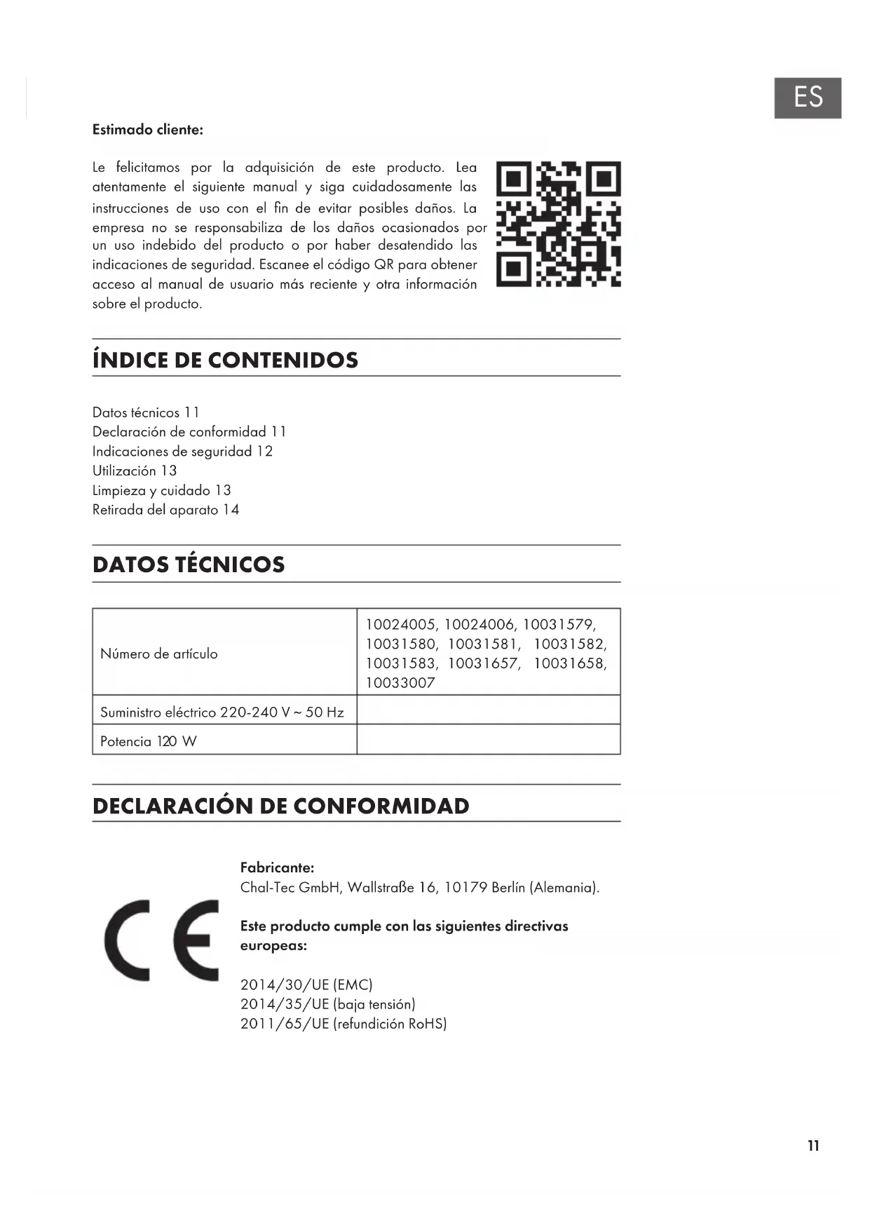 Fabricante: Chal-Tec GmbH, Wallstraße 16, 10179 Berlín (Alemania). Este producto cumple con las siguientes directivas europeas: 2014/30/UE (EMC) 2014/35/UE (baja tensión) 2011/65/UE (refundición RoHS) Datos técnicos11 Declaración de conformidad11 Indicaciones de seguridad12 Utilización13 Limpieza y cuidado13 Retirada del aparato1412