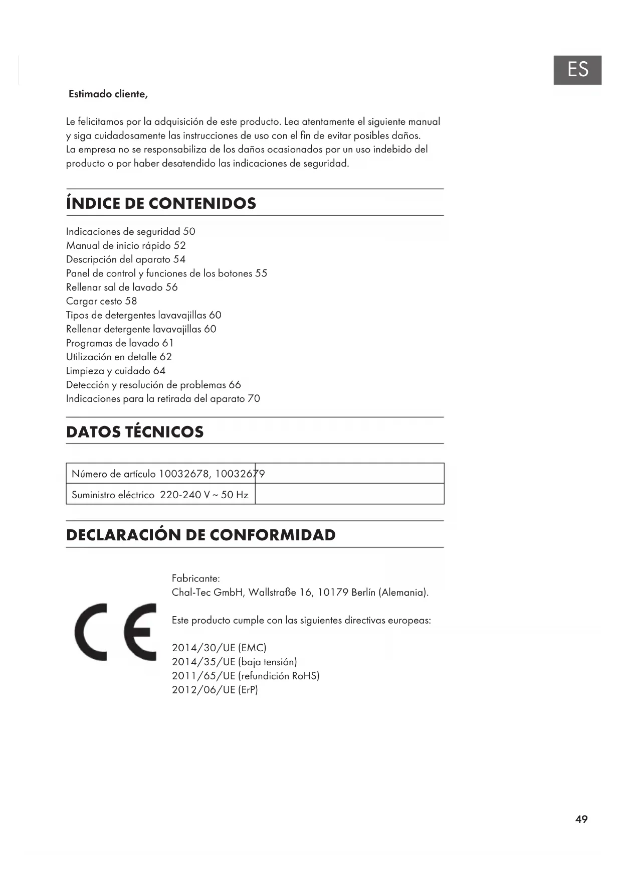 Fabricante: Chal-Tec GmbH, Wallstraße 16, 10179 Berlín (Alemania). Este producto cumple con las siguientes directivas europeas: 2014/30/UE (EMC) 2014/35/UE (baja tensión) 2011/65/UE (refundición RoHS) 2012/06/UE (ErP) English Español Français Italiano Indicaciones de seguridad50 Manual de inicio rápido52 Descripción del aparato54 Panel de control y funciones de los botones55 Rellenar sal de lavado56 Cargar cesto58 Tipos de detergentes lavavajillas60 Rellenar detergente lavavajillas60 Programas de lavado61 Utilización en detalle62 Limpieza y cuidado64 Detección y resolución de problemas66 Indicaciones para la retirada del aparato70 Estimado cliente, Le felicitamos por la adquisición de este producto. Lea atentamente el siguiente manual y siga cuidadosamente las instrucciones de uso con el n de evitar posibles daños. La empresa no se responsabiliza de los daños ocasionados por un uso indebido del producto o por haber desatendido las indicaciones de seguridad.