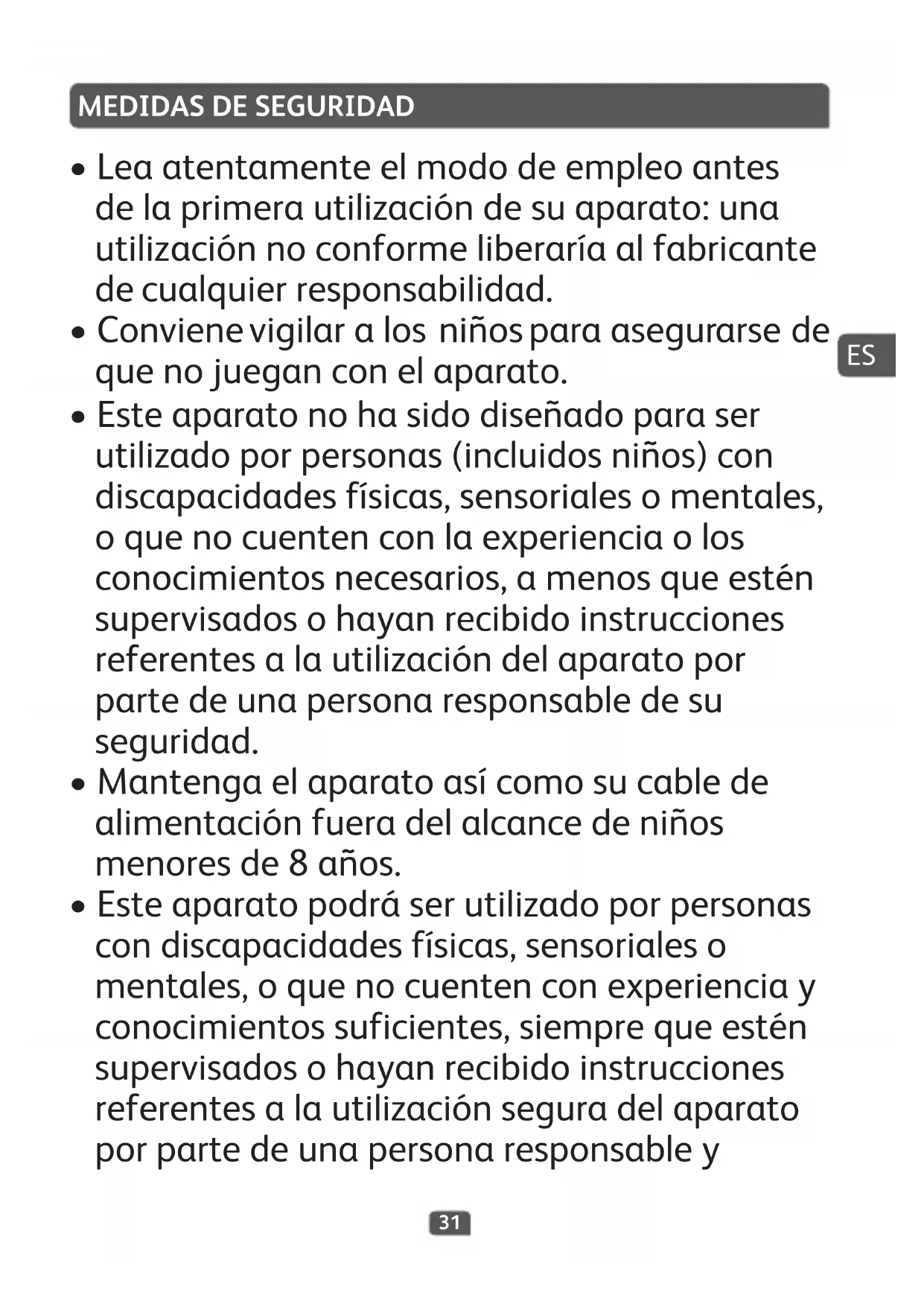 - Esteaparatopodráserutilizadoporpersonas condiscapacidadesfísicas,sensorialeso mentales,oquenocuentenconexperienciay conocimientossuficientes,siemprequeestén supervisadosohayanrecibidoinstrucciones referentesalautilizaciónseguradelaparato porpartedeunapersonaresponsabley ES32