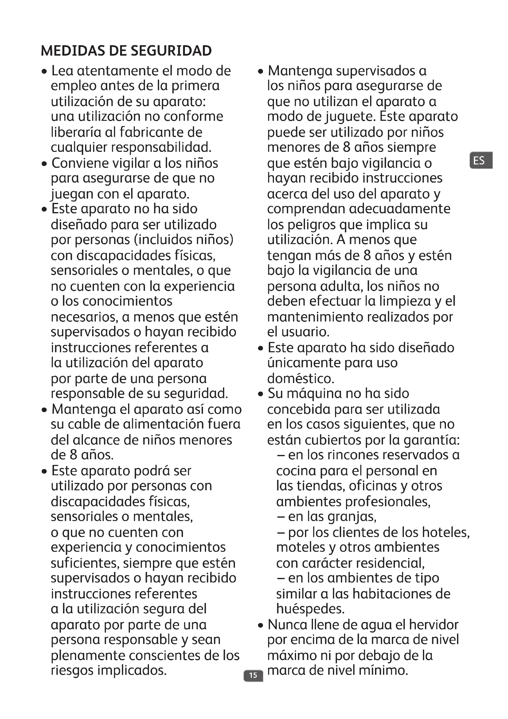 Para evitar cualquier accidente: no lleve en brazos a un niño o un bebé cuando beba o transporte una bebida caliente. ¡¡PARTICIPE EN LA CONSERVACIÓN DEL MEDIO AMBIENTE!! Su electrodoméstico contiene materiales recuperables y/o reciclables. Entréguelo al final de su vida útil, en un Centro de Recogida Específico o en uno de nuestros Servicios Oficiales Post Venta donde será tratado de forma adecuada. ES18