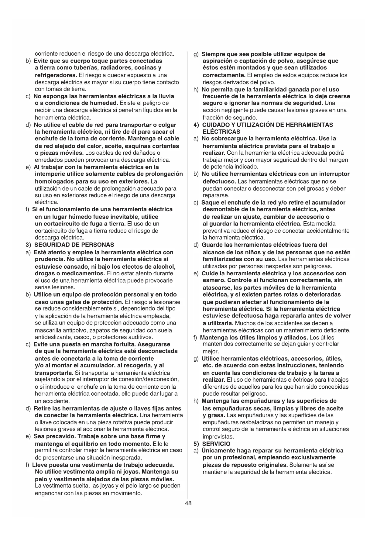 ELÉCTRICAS a) No sobrecargue la herramienta eléctrica. Use la herramienta eléctrica prevista para el trabajo a realizar. Con la herramienta eléctrica adecuada podrá trabajar mejor y con mayor seguridad dentro del margen de potencia indicado. b) No utilice herramientas eléctricas con un interruptor defectuoso. Las herramientas eléctricas que no se puedan conectar o desconectar son peligrosas y deben repararse. c) Saque el enchufe de la red y/o retire el acumulador desmontable de la herramienta eléctrica, antes de realizar un ajuste, cambiar de accesorio o al guardar la herramienta eléctrica. Esta medida preventiva reduce el riesgo de conectar accidentalmente la herramienta eléctrica. d) Guarde las herramientas eléctricas fuera del alcance de los niños y de las personas que no estén familiarizadas con su uso. Las herramientas eléctricas utilizadas por personas inexpertas son peligrosas. e) Cuide la herramienta eléctrica y los accesorios con esmero. Controle si funcionan correctamente, sin atascarse, las partes móviles de la herramienta eléctrica, y si existen partes rotas o deterioradas que pudieran afectar al funcionamiento de la herramienta eléctrica. Si la herramienta eléctrica estuviese defectuosa haga repararla antes de volver a utilizarla. Muchos de los accidentes se deben a herramientas eléctricas con un mantenimiento deciente. f) Mantenga los útiles limpios y alados. Los útiles mantenidos correctamente se dejan guiar y controlar mejor. g) Utilice herramientas eléctricas, accesorios, útiles, etc. de acuerdo con estas instrucciones, teniendo en cuenta las condiciones de trabajo y la tarea a realizar. El uso de herramientas eléctricas para trabajos diferentes de aquellos para los que han sido concebidas puede resultar peligroso. h) Mantenga las empuñaduras y las supercies de las empuñaduras secas, limpias y libres de aceite y grasa. Las empuñaduras y las supercies de las empuñaduras resbaladizas no permiten un manejo y control seguro de la herramienta eléctrica en situaciones imprevistas.