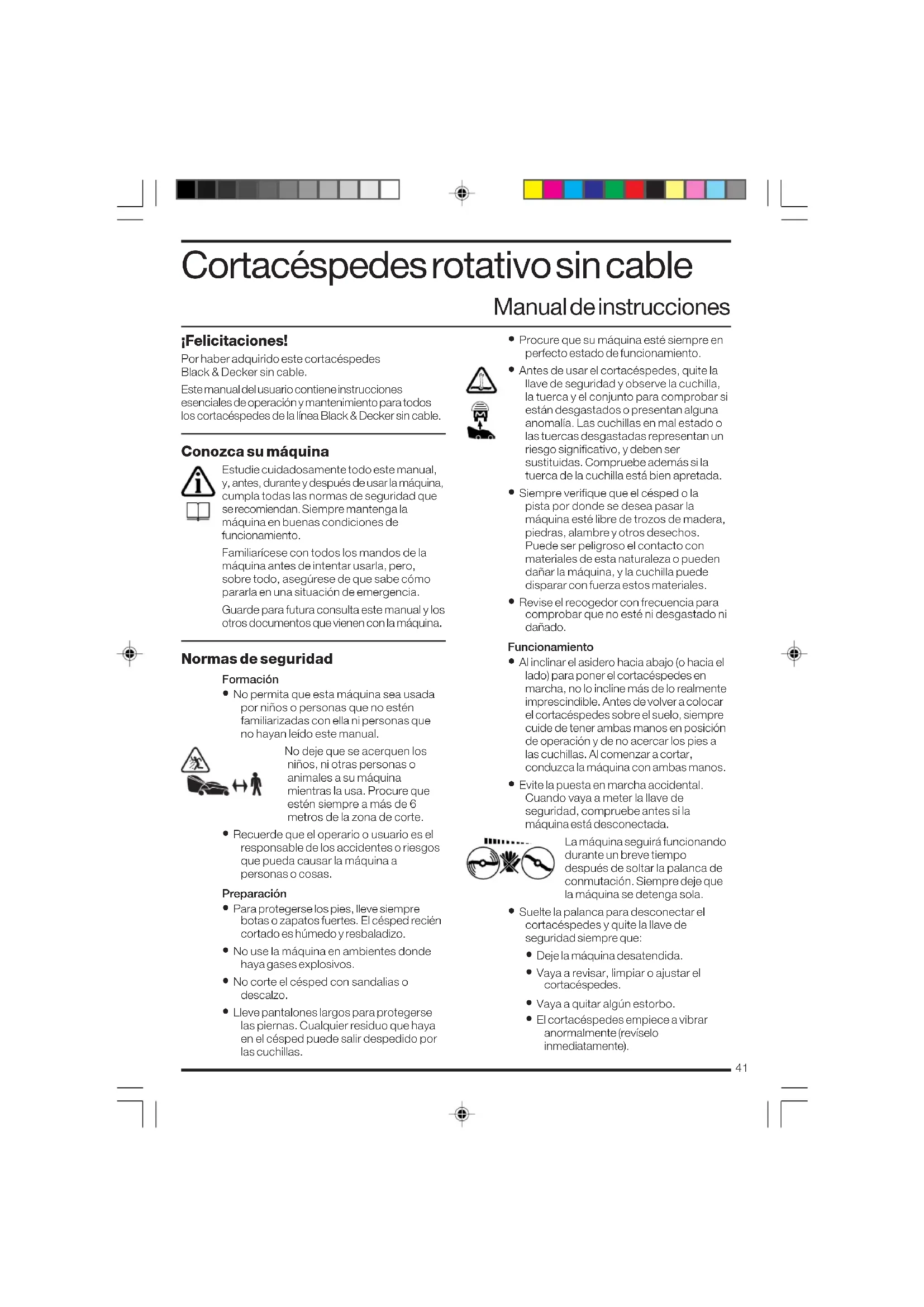 (gegarandeerd) dB(A) 96 Gewogen kwadratische gemiddelde waarde van de versnelling overeenkomstig EN 50144: Brian Cooke Director of Engineering Spennymoor, County Durham DL16 6JG, United Kingdom 1-12-200141 ¡Felicitaciones! Por haber adquirido este cortacéspedes Black & Decker sin cable. Este manual del usuario contiene instrucciones esenciales de operación y mantenimiento para todos los cortacéspedes de la línea Black & Decker sin cable. Conozca su máquina Estudie cuidadosamente todo este manual, y, antes, durante y después de usar la máquina, cumpla todas las normas de seguridad que se recomiendan. Siempre mantenga la máquina en buenas condiciones de funcionamiento. Familiarícese con todos los mandos de la máquina antes de intentar usarla, pero, sobre todo, asegúrese de que sabe cómo pararla en una situación de emergencia. Guarde para futura consulta este manual y los otros documentos que vienen con la máquina. Normas de seguridad Formación