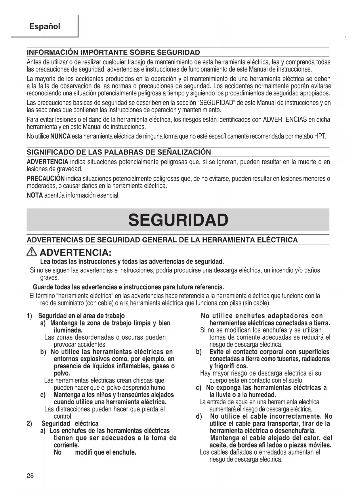Antes de utilizar o de realizar cualquier trabajo de mantenimiento de esta herramienta eléctrica, lea y comprenda todas las precauciones de seguridad, advertencias e instrucciones de funcionamiento de este Manual de instrucciones. La mayoría de los accidentes producidos en la operación y el mantenimiento de una herramienta eléctrica se deben a la falta de observación de las normas o precauciones de seguridad. Los accidentes normalmente podrán evitarse reconociendo una situación potencialmente peligrosa a tiempo y siguiendo los procedimientos de seguridad apropiados. Las precauciones básicas de seguridad se describen en la sección “SEGURIDAD” de este Manual de instrucciones y en las secciones que contienen las instrucciones de operación y mantenimiento. Para evitar lesiones o el daño de la herramienta eléctrica, los riesgos están identifi cados con ADVERTENCIAS en dicha herramienta y en este Manual de instrucciones. No utilice NUNCA esta herramienta eléctrica de ninguna forma que no esté específi camente recomendada por metabo HPT. SIGNIFICADO DE LAS PALABRAS DE SEÑALIZACIÓN ADVERTENCIA indica situaciones potencialmente peligrosas que, si se ignoran, pueden resultar en la muerte o en lesiones de gravedad. PRECAUCIÓN indica situaciones potencialmente peligrosas que, de no evitarse, pueden resultar en lesiones menores o moderadas, o causar daños en la herramienta eléctrica. NOTA acentúa información esencial. SEGURIDAD ADVERTENCIAS DE SEGURIDAD GENERAL DE LA HERRAMIENTA ELÉCTRICA ADVERTENCIA: Lea todas las instrucciones y todas las advertencias de seguridad. Si no se siguen las advertencias e instrucciones, podría producirse una descarga eléctrica, un incendio y/o daños graves. Guarde todas las advertencias e instrucciones para futura referencia. El término “herramienta eléctrica” en las advertencias hace referencia a la herramienta eléctrica que funciona con la red de suministro (con cable) o a la herramienta eléctrica que funciona con pilas (sin cable).