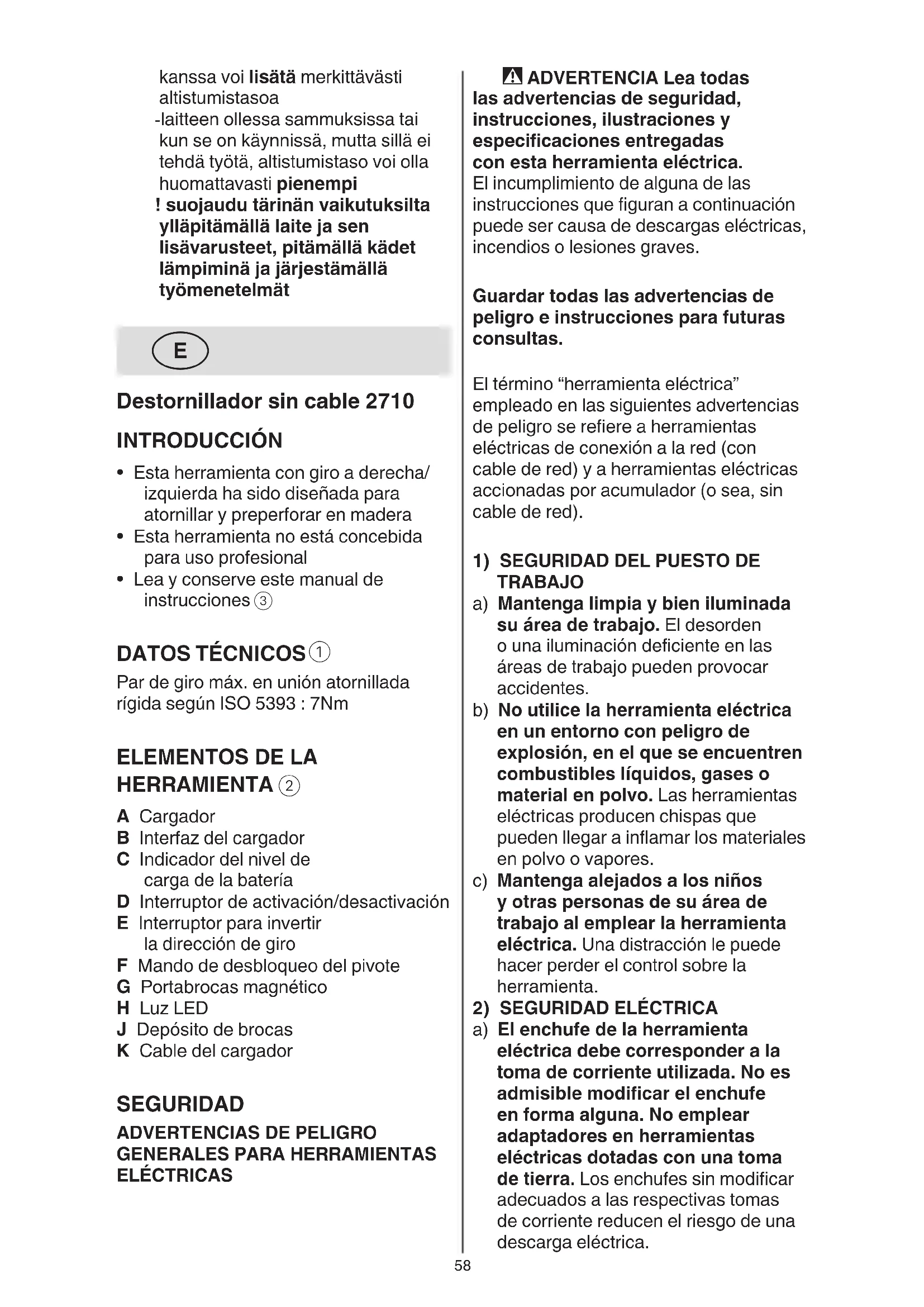 A Cargador B Interfaz del cargador C Indicador del nivel de carga de la batería D Interruptor de activación/desactivación E Interruptor para invertir la dirección de giro F Mando de desbloqueo del pivote G Portabrocas magnético H Luz LED J Depósito de brocas K Cable del cargador SEGURIDAD