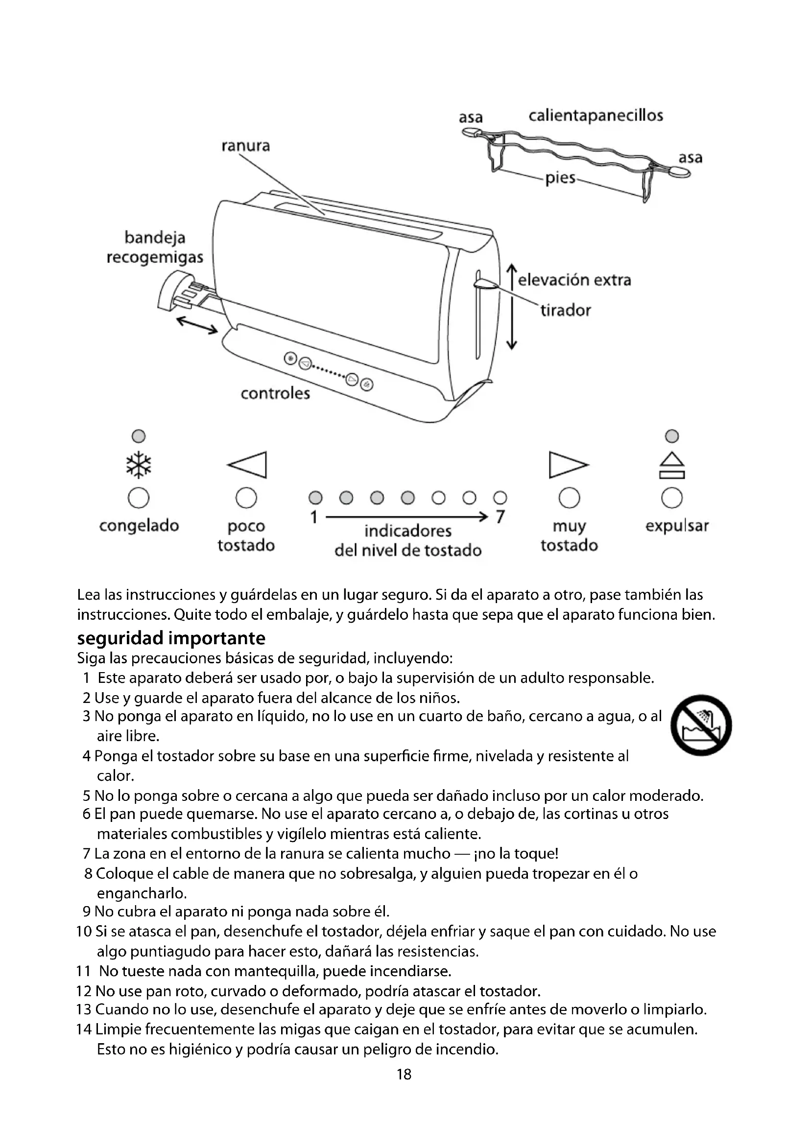 La tostadora est e1 dise f1ada principalmente para pan. Evite tostar alimentos demasiado gruesos o h famedos que puedan obstruir las ranuras.