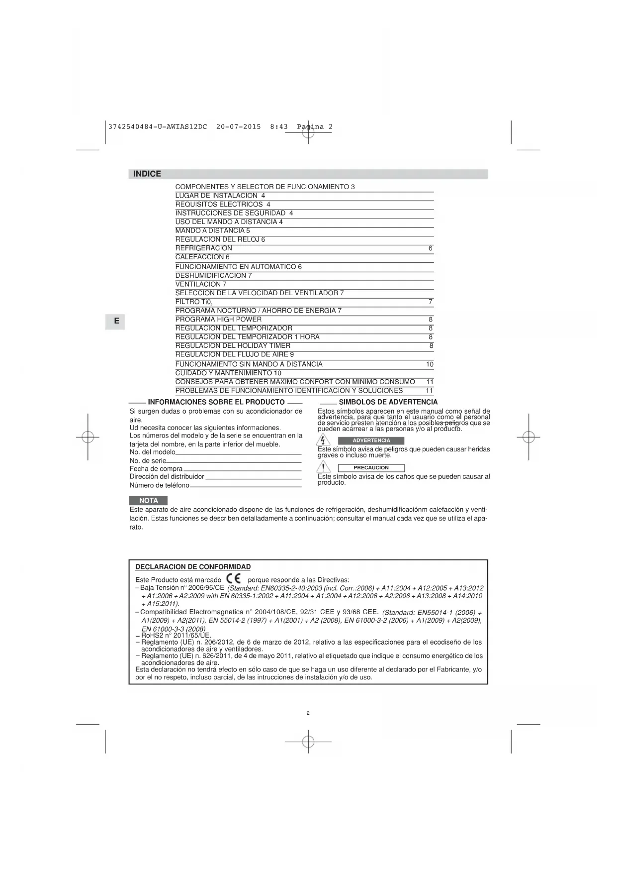| Instrucciones de seguridad | No obstruir las rejillas de ventilación, verificar fugas de refrigerante |