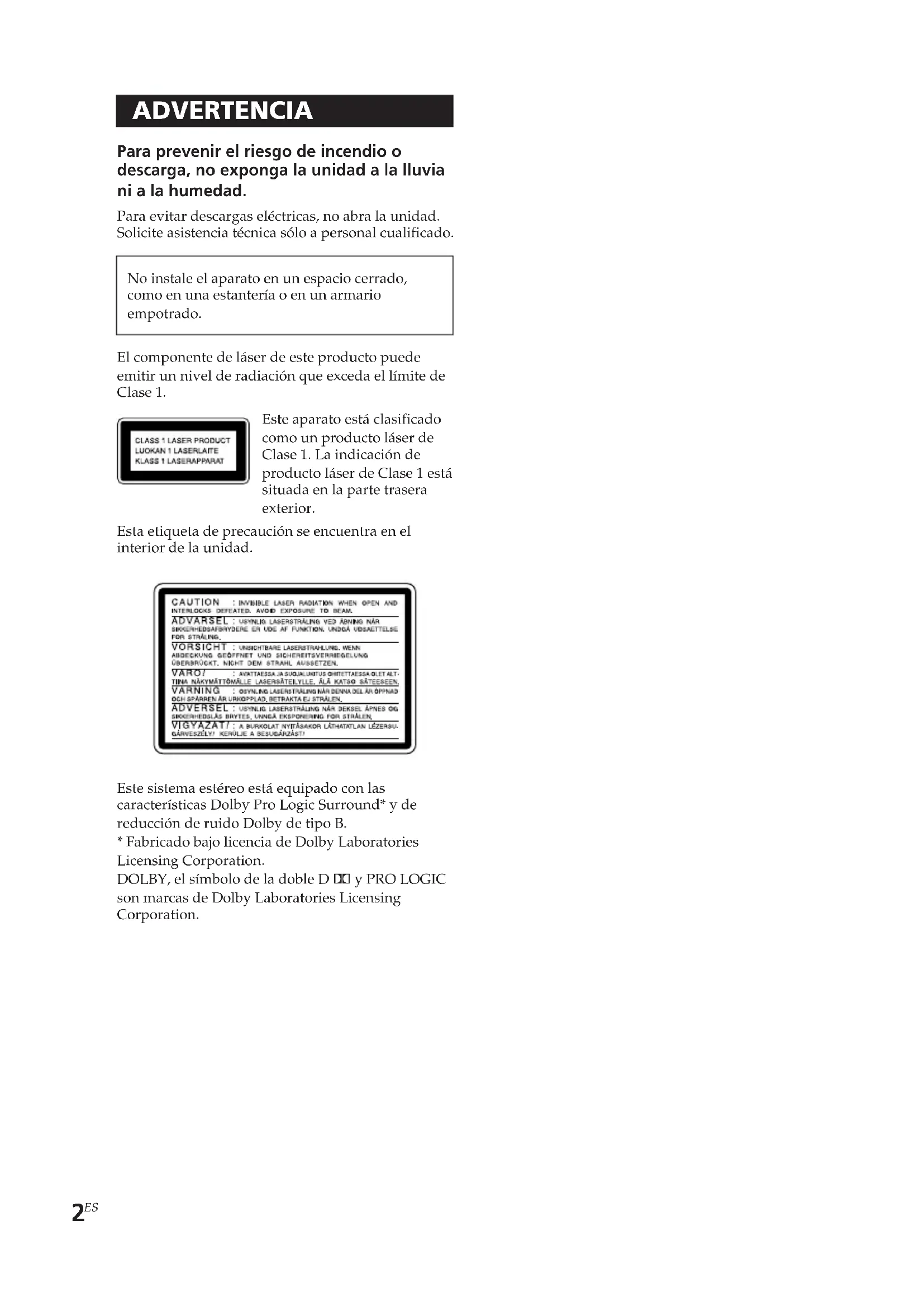 ADVERTENCIA Para prevenir el riesgo de incendio o descarga, no exponga la unidad a la lluvia ni a la humedad. Para evitar descargas eléctricas, no abra la unidad. Solicite asistencia técnica sólo a personal cualificado. No instale el aparato en un espacio cerrado, como en una estantería o en un armario empotrado. El componente de láser de este producto puede emitir un nivel de radiación que exceda el límite de Clase 1. Esta etiqueta de precaución se encuentra en el interior de la unidad. Este sistema estéreo está equipado con las características Dolby Pro Logic Surround* y de reducción de ruido Dolby de tipo B.