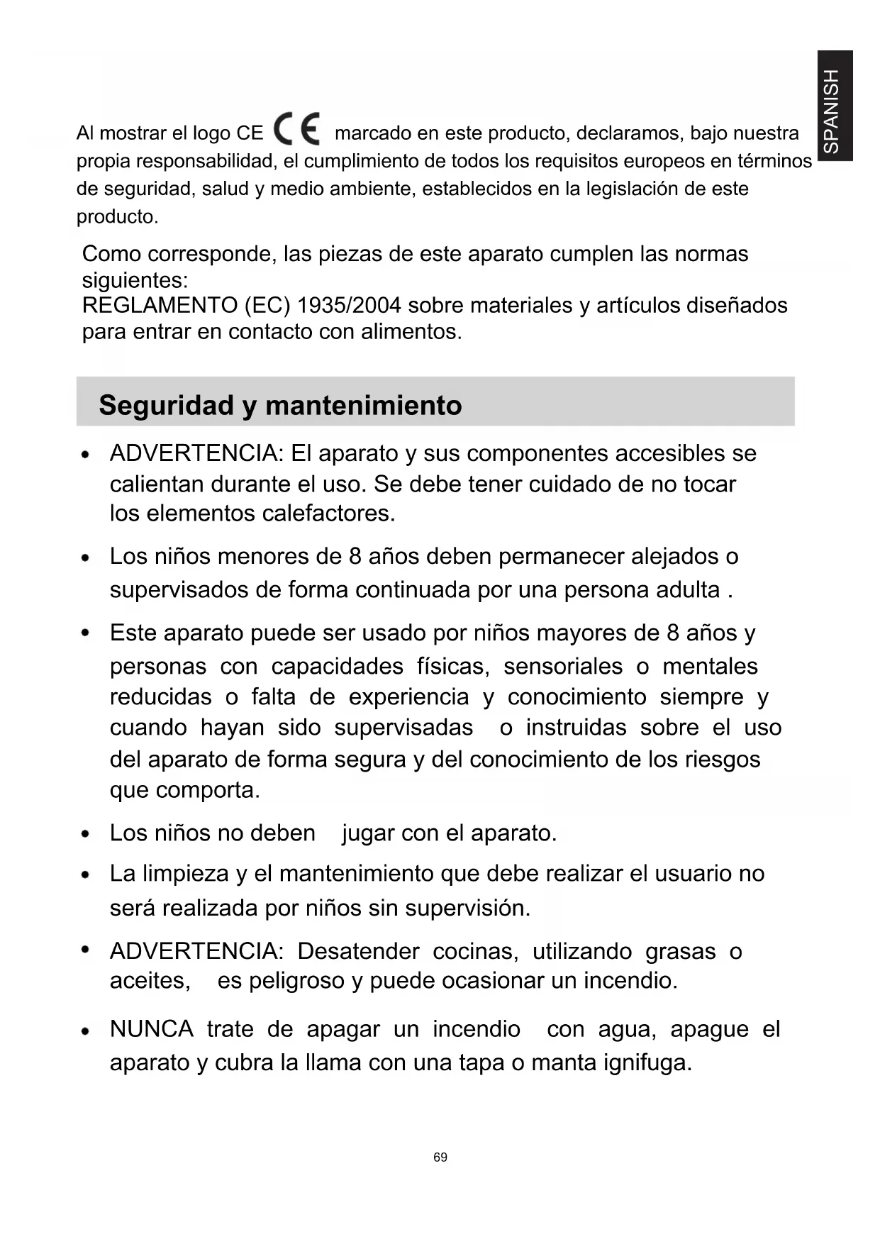Il prodotto è garantito, oltre che ai sensi di legge, alle condizioni e nei termini riportati sul certificato di garanzia convenzionale inserito nel prodotto. Il certificato dovrà essere conservato e mostrato al nostro Centro di Assistenza Tecnica Autorizzato, in caso di necessità, insieme allo scontrino comprovante l’acquisto dell’elettrodomestico. Puoi consultare le condizioni di garanzia anche sul nostro sito internet. Per ottenere assistenza compila l’apposito form on-line oppure contattaci al numero che trovi indicato nella pagina di assistenza del nostro sito internet.Dichiarazione speciale Tutti i contenuti di questo manuale sono stati attentamente controllati. Tuttavia, il produttore non si assume responsabilità per errori od omissioni nella stampa. Inoltre, in un’eventuale revisione del manuale di istruzioni, potranno essere inserite modifiche tecniche senza preavviso. L’immagine del prodotto si riferisce a quello attuale. domestici. Deve essere eliminato separatamente. Questo elettrodomestico è prodotto secondo la direttiva europea 2012/19/CE sullo smaltimento delle attrezzature elettriche ed elettroniche. Rispettando le direttive imposte sullo smaltimento di questo dispositivo, si aiuta a prevenire eventuali danni all’ambiente e alla salute provocati da un errato smaltimento. Questo simbolo indica che il prodotto non può essere smaltito come i normali rifiuti domestici, ma attraverso i centri di riciclo di materiale elettrico ed elettronico. Per ulteriori informazioni sul trattamento, lo smaltimento ed il riciclo di questo prodotto, contattare il servizio smaltimento rifiuti locale oppure rivolgersi al negozio in cui l’articolo è stato acquistato. ATTENZIONE: non smaltire questo prodotto tra i rifiuti 68ADVERTENCIA: El aparato y sus componentes accesibles se calientan durante el uso. Se debe tener cuidado de no tocar los elementos calefactores. Los niños menores de 8 años deben permanecer alejados o supervisados de forma continuada por una persona adulta . Este aparato puede ser usado por niños mayores de 8 años y personas con capacidades físicas, sensoriales o mentales reducidas o falta de experiencia y conocimiento siempre y cuando hayan sido supervisadas o instruidas sobre el uso del aparato de forma segura y del conocimiento de los riesgos que comporta. Los niños no deben jugar con el aparato. La limpieza y el mantenimiento que debe realizar el usuario no será realizada por niños sin supervisión. ADVERTENCIA: Desatender cocinas, utilizando grasas o aceites, es peligroso y puede ocasionar un incendio. NUNCA trate de apagar un incendio con agua, apague el aparato y cubra la llama con una tapa o manta ignifuga. Seguridad y mantenimiento Al mostrar el logo CE marcado en este producto, declaramos, bajo nuestra propia responsabilidad, el cumplimiento de todos los requisitos europeos en términos de seguridad, salud y medio ambiente, establecidos en la legislación de este producto. Como corresponde, las piezas de este aparato cumplen las normas siguientes: REGLAMENTO (EC) 1935/2004 sobre materiales y artículos para entrar en contacto con alimentos. diseñados SPANISH 69No utilice limpiadores de vapor para la limpieza del aparato. No se deben colocar objetos metálicos como cuchillos, tenedores, cucharas y tapas sobre la placa debido a que se pueden calentar. Elimine cualquier tipo de derrame de la tapa antes de abrirlo. se debe enfriar la superficie de la placa antes de cerrar la tapa. Después de su uso, apague la zona de la placa utilizando su control y no se confíe en el detector de sartenes. el aparato no está ideado para ser utilizado mediante un temporizador externo o un sistema de control remoto independiente. Los medios de desconexión deben ser incorporados en el cableado fijo en conformidad con las reglas del cableado. las instrucciones indicarán el tipo de cable a utilizar, teniendo en cuenta la temperature de la parte posterior del aparato. Si el cable de alimentación está dañado, debe ser reemplazado por el fabricante, su servicio técnico o personas cualificadas, con e l fin de evitar riesgos. ADVERTENCIA: Peligro de incendio: no almacene artículos en las superficies de cocción. ADVERTENCIA: Si la superficie está agrietada, apague el aparato para evitar la posibilidad de una descarga eléctrica. 70PRECAUCIÓN: Con el fin de evitar peligros derivados de alteraciones en el suministro energético, este aparato no debe ser suministrado a través de un dispositivo de conmutación externo, como un temporizador, o conectado a un circuito que sea encendido y apagado frecuentemente por los servicios públicos. El cableado fijo debe incorporar los medios de desconexión que se exigen en la normativa de cableado. En las instrucciones se indica el tipo de cable que se va a utilizar y se tiene en cuenta la temperatura de la superficie trasera del aparato. ADVERTENCIA: Utilice solamente las protecciones que incorpora el electrodoméstico, las protecciones diseñadas por el fabricante del equipo de cocina o las protecciones que indica el fabricante en las instrucciones de uso, según corresponda. El uso de protecciones inadecuadas puede causar accidentes.