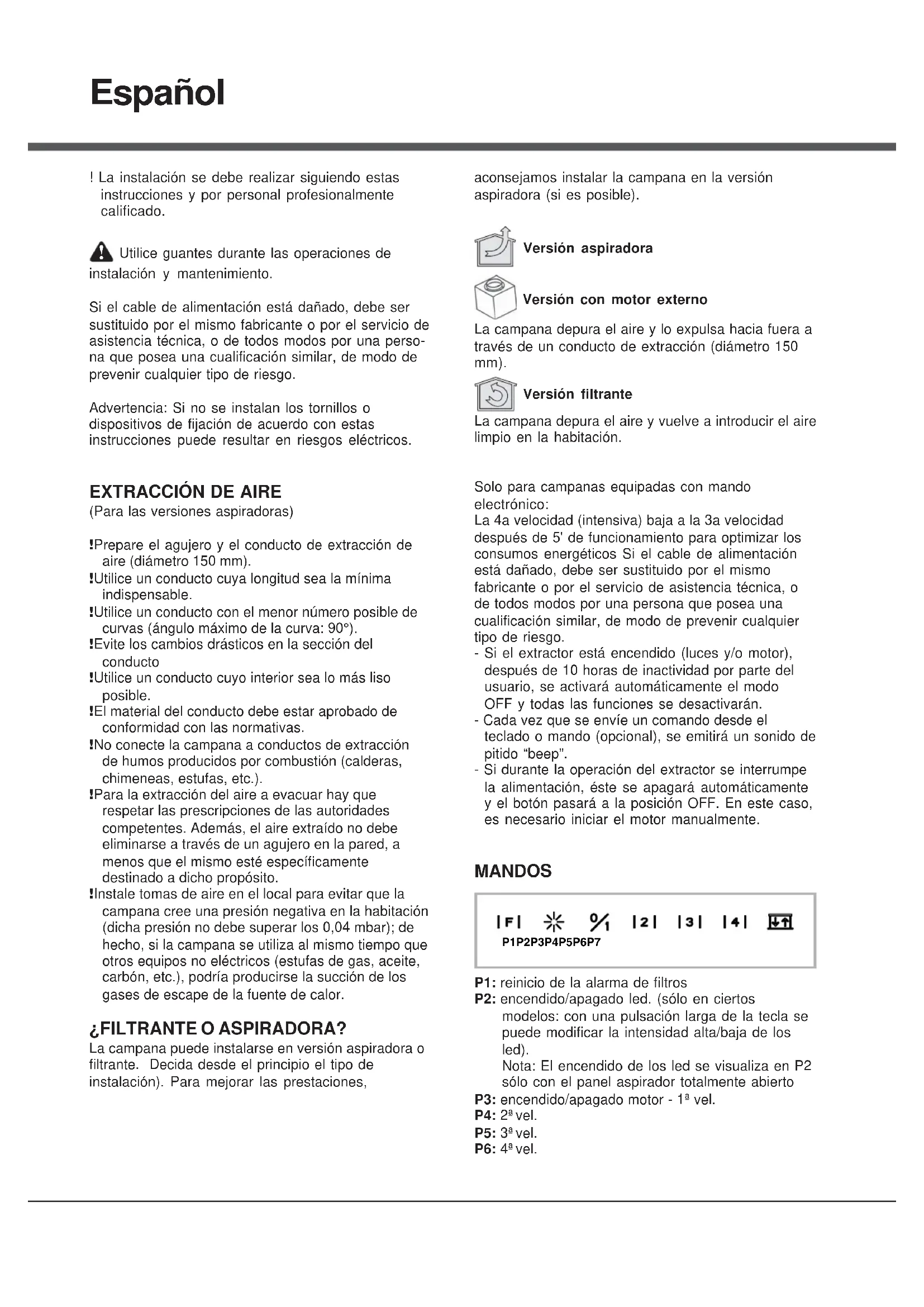 (Para las versiones aspiradoras) ! Prepare el agujero y el conducto de extracción de aire (diámetro 150 mm). ! Utilice un conducto cuya longitud sea la mínima indispensable. ! Utilice un conducto con el menor número posible de curvas (ángulo máximo de la curva: 90°). ! Evite los cambios drásticos en la sección del conducto ! Utilice un conducto cuyo interior sea lo más liso posible. ! El material del conducto debe estar aprobado de conformidad con las normativas. ! No conecte la campana a conductos de extracción de humos producidos por combustión (calderas, chimeneas, estufas, etc.). ! Para la extracción del aire a evacuar hay que respetar las prescripciones de las autoridades competentes. Además, el aire extraído no debe eliminarse a través de un agujero en la pared, a menos que el mismo esté específicamente destinado a dicho propósito. ! Instale tomas de aire en el local para evitar que la campana cree una presión negativa en la habitación (dicha presión no debe superar los 0,04 mbar); de hecho, si la campana se utiliza al mismo tiempo que otros equipos no eléctricos (estufas de gas, aceite, carbón, etc.), podría producirse la succión de los gases de escape de la fuente de calor. ¿FILTRANTE O ASPIRADORA? La campana puede instalarse en versión aspiradora o filtrante. Decida desde el principio el tipo de instalación). Para mejorar las prestaciones, aconsejamos instalar la campana en la versión aspiradora (si es posible). Versión aspiradora Versión con motor externo La campana depura el aire y lo expulsa hacia fuera a través de un conducto de extracción (diámetro 150 mm). Versión filtrante La campana depura el aire y vuelve a introducir el aire limpio en la habitación. Solo para campanas equipadas con mando electrónico: La 4a velocidad (intensiva) baja a la 3a velocidad después de 5' de funcionamiento para optimizar los consumos energéticos Si el cable de alimentación está dañado, debe ser sustituido por el mismo fabricante o por el servicio de asistencia técnica, o de todos modos por una persona que posea una cualificación similar, de modo de prevenir cualquier tipo de riesgo. - Si el extractor está encendido (luces y/o motor), después de 10 horas de inactividad por parte del usuario, se activará automáticamente el modo OFF y todas las funciones se desactivarán. - Cada vez que se envíe un comando desde el teclado o mando (opcional), se emitirá un sonido de pitido “beep”. - Si durante la operación del extractor se interrumpe la alimentación, éste se apagará automáticamente y el botón pasará a la posición OFF. En este caso, es necesario iniciar el motor manualmente. MANDOS P1 P2 P3 P4 P5 P6 P7 P1: reinicio de la alarma de filtros P2: encendido/apagado led. (sólo en ciertos modelos: con una pulsación larga de la tecla se puede modificar la intensidad alta/baja de los led). Nota: El encendido de los led se visualiza en P2 sólo con el panel aspirador totalmente abierto P3: encendido/apagado motor - 1ª vel. P4: 2ª vel. P5: 3ª vel. P6: 4ª vel.P7: subida/bajada del panel aspirador (en la fase de apertura se puede detener el panel a la altura deseada con una segunda pulsación de la tecla) Función de temporizador de 5' Con una pulsación larga (>2") de las teclas P3, P4, P5 o P6 se activa la función Temporizador de 5'. Transcurridos los minutos el motor se apaga y el carro se cierra. Las luces pasan de la intensidad Alta a la Baja. Cuando la función está activa el led correspondiente a la velocidad actual del motor destella. Visualización de alarma de filtros: Filtros antigrasa: Después de 30 h de funcionamiento del motor, el led de la tecla P1 se enciende durante 30'' cada vez que se apaga el motor. Filtro de carbón: Después de 120 h de funcionamiento del motor, el led de la tecla P1 destella durante 30'' cada vez que se apaga el motor. MANDOS P1: reinicio de la alarma de filtros P2: encendido/apagado motor - 1ª vel. P3: 2ª vel. P4: 3ª vel. P5: 4ª vel. P6: subida/bajada del panel aspirador (en la fase de apertura se puede detener el panel a la altura deseada con una segunda pulsación de la tecla) Función de temporizador de 5' Con una pulsación larga (>2") de las teclas P2, P3, P4 o P5 se activa la función Temporizador de 5'. Transcurridos los minutos el motor se apaga y el carro se cierra. Las luces pasan de la intensidad Alta a la Baja. Cuando la función está activa el led correspondiente a la velocidad actual del motor destella. Visualización de alarma de filtros: Filtros antigrasa: Después de 30 h de funcionamiento del motor, el led de la tecla P1 se enciende durante 30'' cada vez que se apaga el motor. Filtro de carbón: Después de 120 h de funcionamiento del motor, el led de la tecla P1 destella durante 30'' cada vez que se apaga el motor. MANDOS P1: encendido/apagado motor - 1ª vel. P2: 2ª vel. P3: 3ª vel. P4: 4ª vel. P5: subida/bajada del panel aspirador (en la fase de apertura se puede detener el panel a la altura deseada con una segunda pulsación de la tecla) Función de temporizador de 5' Con el motor encendido y presionando por tiempo las teclas P1-P4 (según la velocidad configurada), se activa la función Timer 5'. Cuando se activa esta función, destella el led que corresponde a la velocidad (L1-L4). Al transcurrir 5', el motor se apaga y el carro se cierra. Visualización de alarma de filtros: Después de 30 horas de funcionamiento del motor, los LED L1-L5 se encienden por 30" cada vez que se apaga el motor. Después de 120 horas de funcionamiento del motor, los LED L1-L5 destellan por 30" cada vez que se apaga el motor. Para efectuar el RESET de la alarma, hay que pulsar una de las teclas P1-P5 por 2" durante la visualización de la alarma.