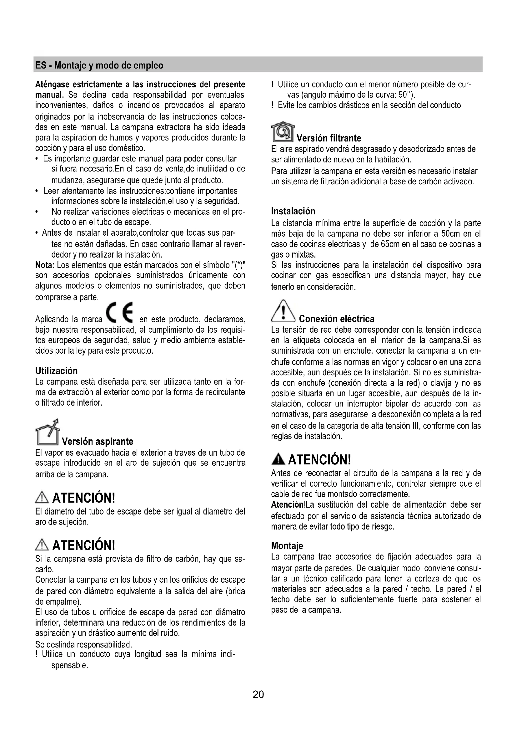 - Antes de instalar el aparato,controlar que todas sus par- tes no estèn dañadas. En caso contrario llamar al reven- dedor y no realizar la instalaciòn. Nota: Los elementos que están marcados con el símbolo "(*)" son accesorios opcionales suministrados únicamente con algunos modelos o elementos no suministrados, que deben comprarse a parte. Aplicando la marca en este producto, declaramos, bajo nuestra responsabilidad, el cumplimiento de los requisi- tos europeos de seguridad, salud y medio ambiente estable- cidos por la ley para este producto. Utilización La campana està diseñada para ser utilizada tanto en la for- ma de extracciòn al exterior como por la forma de recirculante o filtrado de interior. Versión aspirante El vapor es evacuado hacia el exterior a traves de un tubo de escape introducido en el aro de sujeción que se encuentra arriba de la campana. ATENCIÓN! El diametro del tubo de escape debe ser igual al diametro del aro de sujeción. ATENCIÓN! Si la campana está provista de filtro de carbón, hay que sa- carlo. Conectar la campana en los tubos y en los orificios de escape de pared con diámetro equivalente a la salida del aire (brida de empalme). El uso de tubos u orificios de escape de pared con diámetro inferior, determinará una reducción de los rendimientos de la aspiración y un drástico aumento del ruido. Se deslinda responsabilidad. ! Utilice un conducto cuya longitud sea la mínima indi- spensable. ! Utilice un conducto con el menor número posible de cur- vas (ángulo máximo de la curva: 90°). ! Evite los cambios drásticos en la sección del conducto Versión filtrante El aire aspirado vendrá desgrasado y desodorizado antes de ser alimentado de nuevo en la habitación. Para utilizar la campana en esta versión es necesario instalar un sistema de filtración adicional a base de carbón activado.